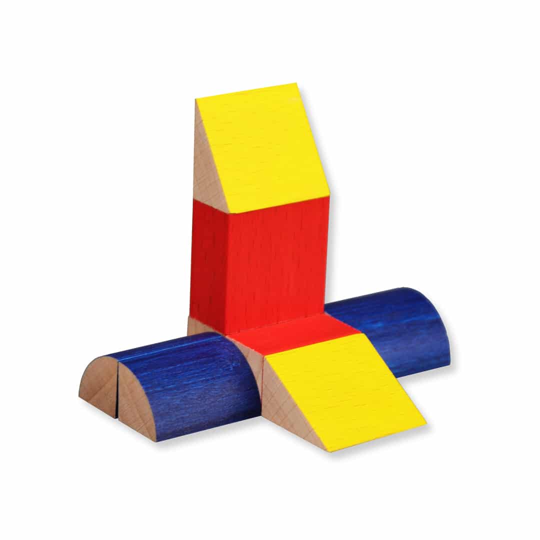 - Bausteine: 8 Steine (Grundmaß 25 mm) in den Farben Rot, Gelb und Blau