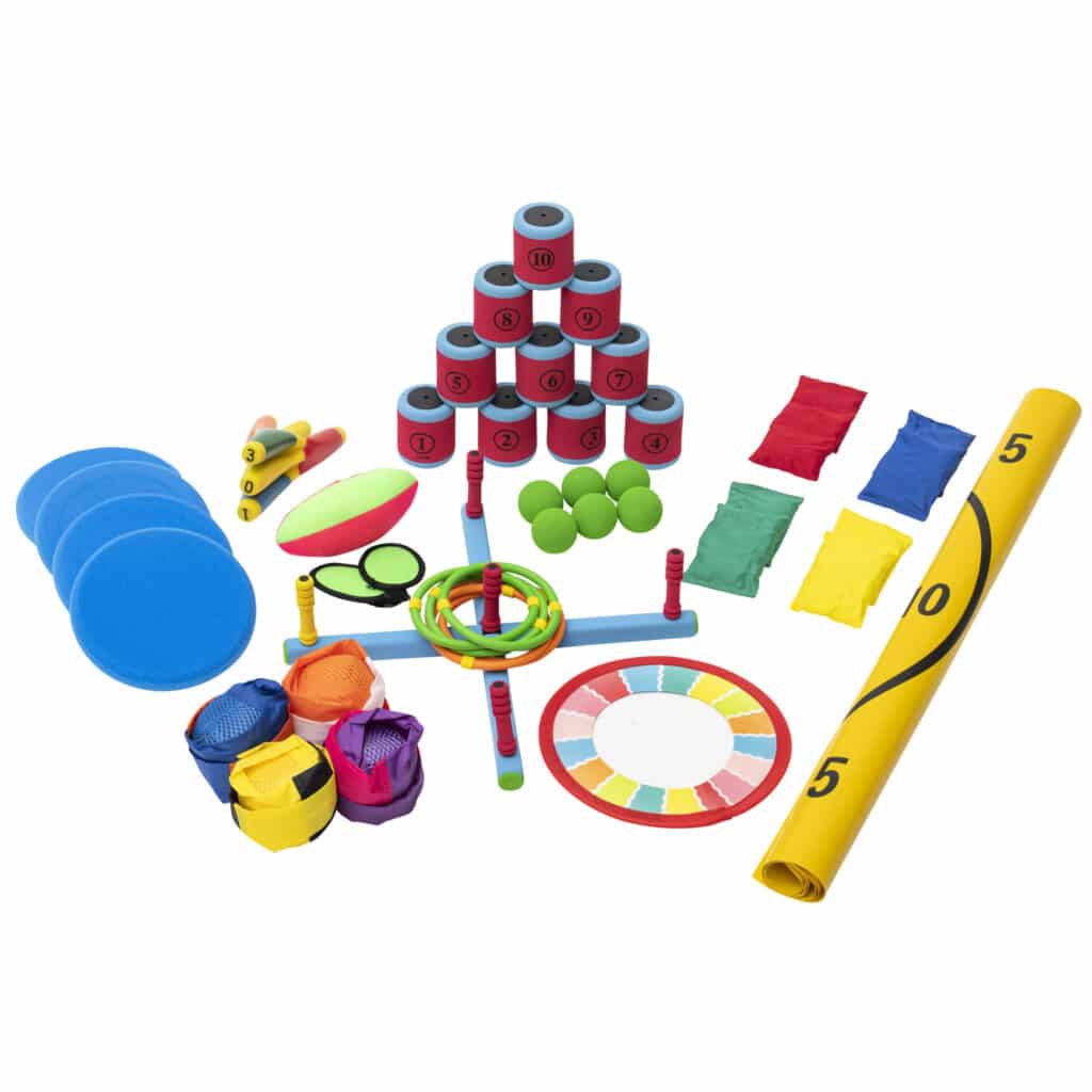 Mit dem großen Set der Wurfspiele können Sie verschiedene Stationen aufbauen, an denen die Kinder ihre Fähigkeiten im Werfen testen können. Ob Dosen-Wurfspiel, Soft-Wurfspiel, Klett-Football oder Disc-Kegeln – die Auswahl ist breit gefächert und sorgt für jede Menge Abwechslung.