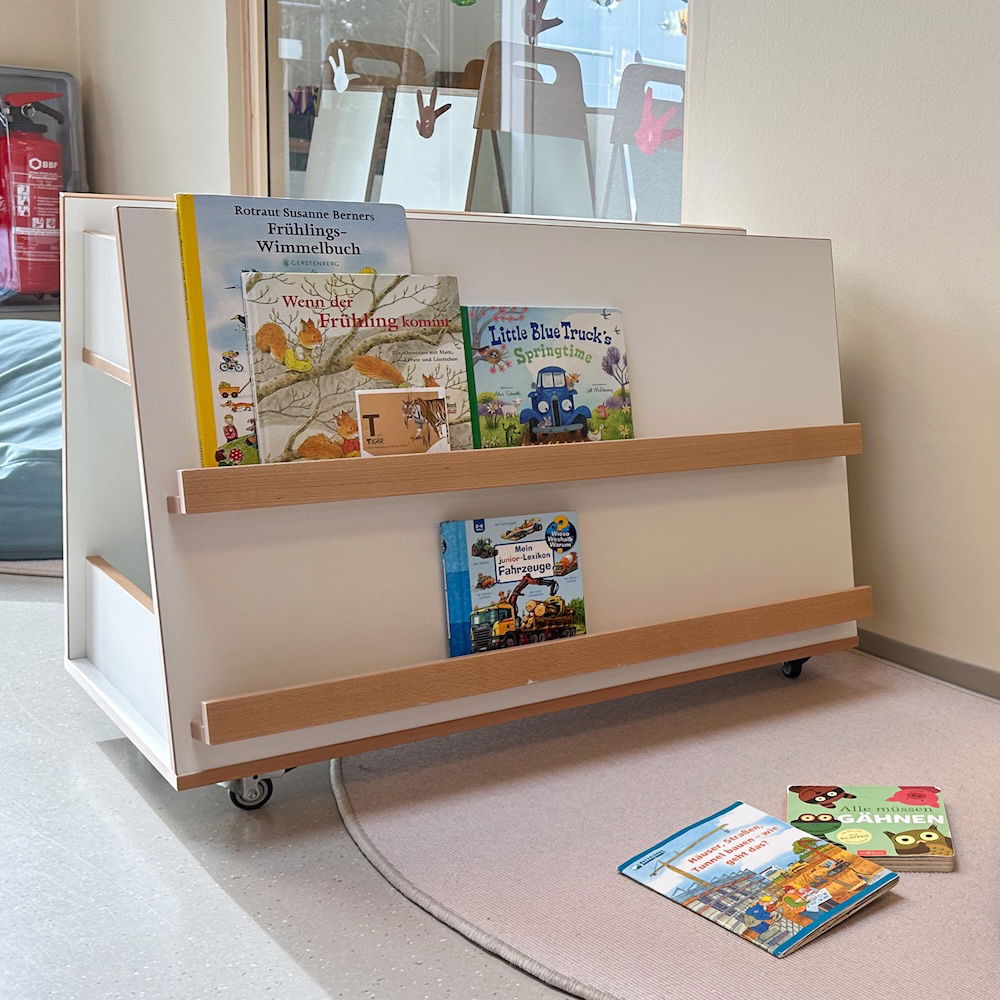 Der große Bücherwagen ist das Herzstück der Leseecke. Seine schrägen Seitenflächen dienen als ideale Präsentationsfläche für Neuanschaffungen oder Themenwochen. Wenn Bücher so attraktiv und zugänglich präsentiert werden, greifen Kinder öfter und lieber zu, was die frühkindliche Lesekompetenz spielerisch fördert. - Vielfältige Rückzugsmöglichkeiten