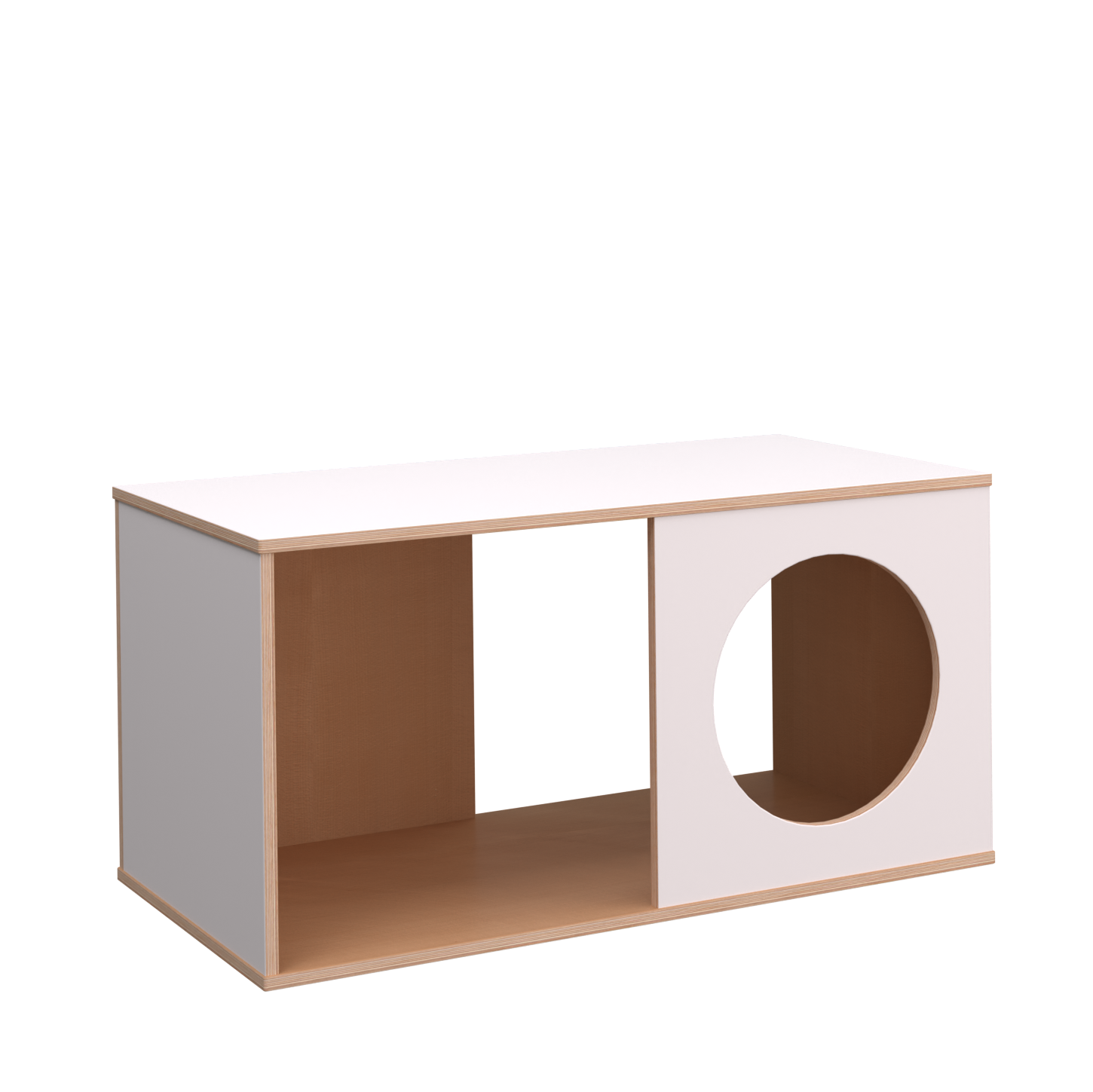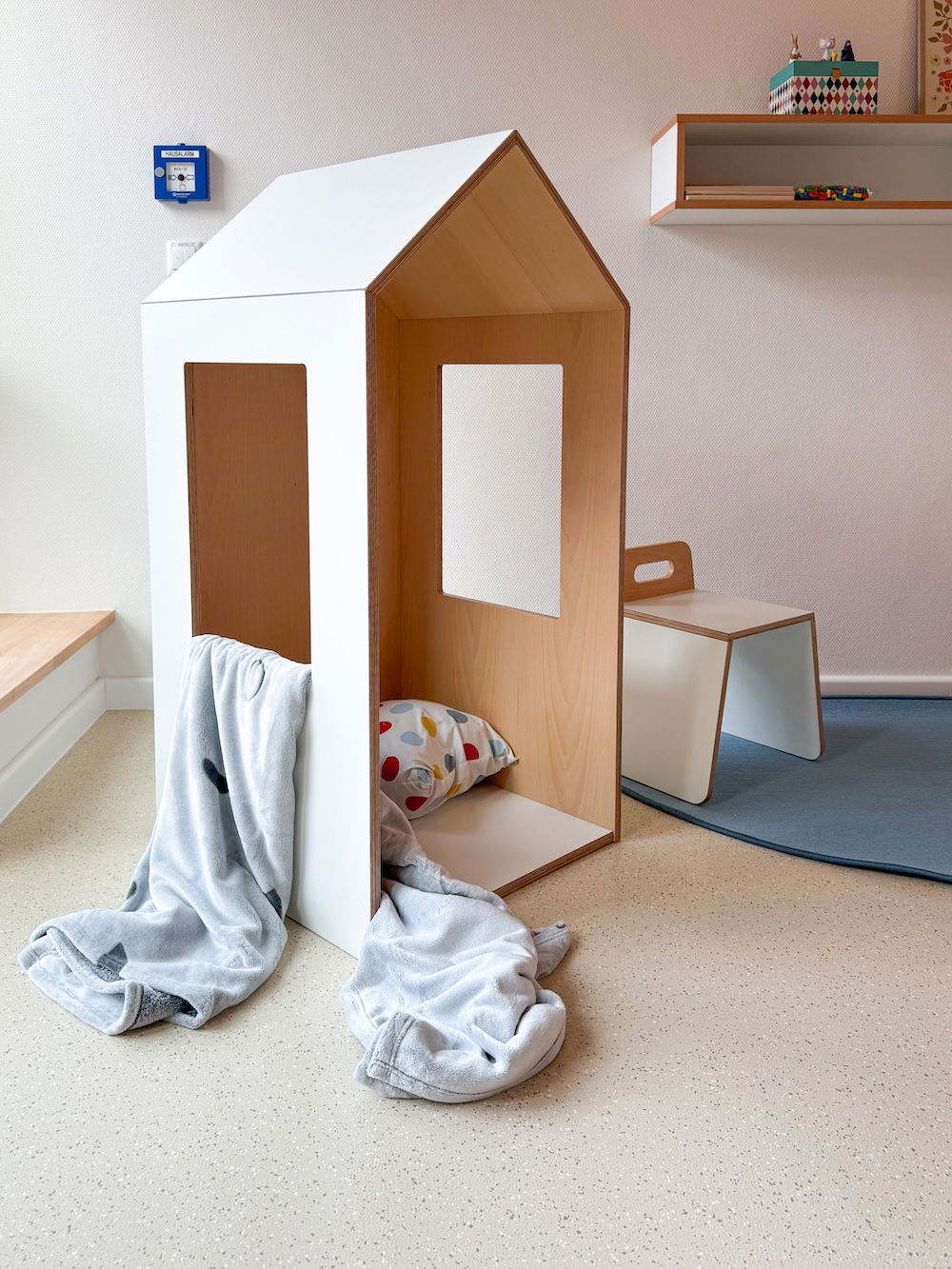 Kinder brauchen Nischen. Das Set bietet gleich mehrere davon: Das große Haus vermittelt Schutz und Geborgenheit, während der Kasten mit seinem runden „Fenster“ einen spannenden Ausblick bietet, ohne die Privatsphäre zu stören. Diese Orte erlauben es den Kindern, sich aus dem Gruppengeschehen zurückzuziehen und Energie zu tanken. - Intelligenter Stauraum