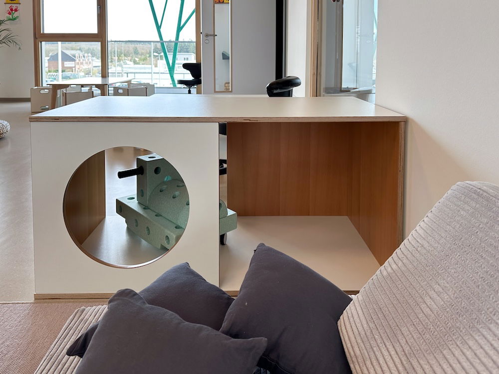 Diese Möbelkombination wurde entwickelt, um pädagogische Arbeit zu unterstützen und Kindern einen Raum für Entspannung und Bildung zu bieten.