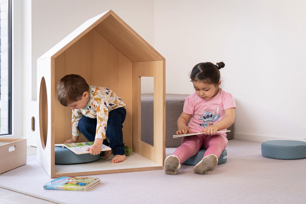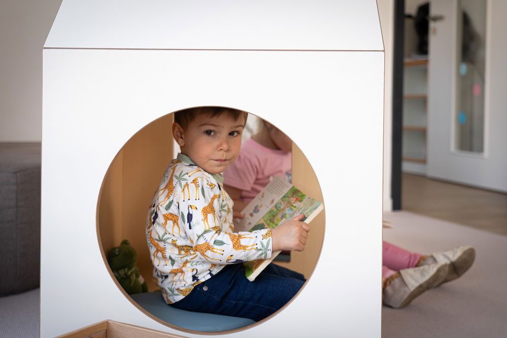 Im lebhaften Gruppenalltag sind ruhige Nischen Gold wert. Das Lese-Häuschen bietet einen geschützten Raum für ein Kind, um sich allein mit einem Buch zu beschäftigen. Die gepolsterte Podest-Ecke ist wiederum der perfekte Ort, um zu zweit oder in einer kleinen Gruppe zu kuscheln und gemeinsam Geschichten zu erleben.