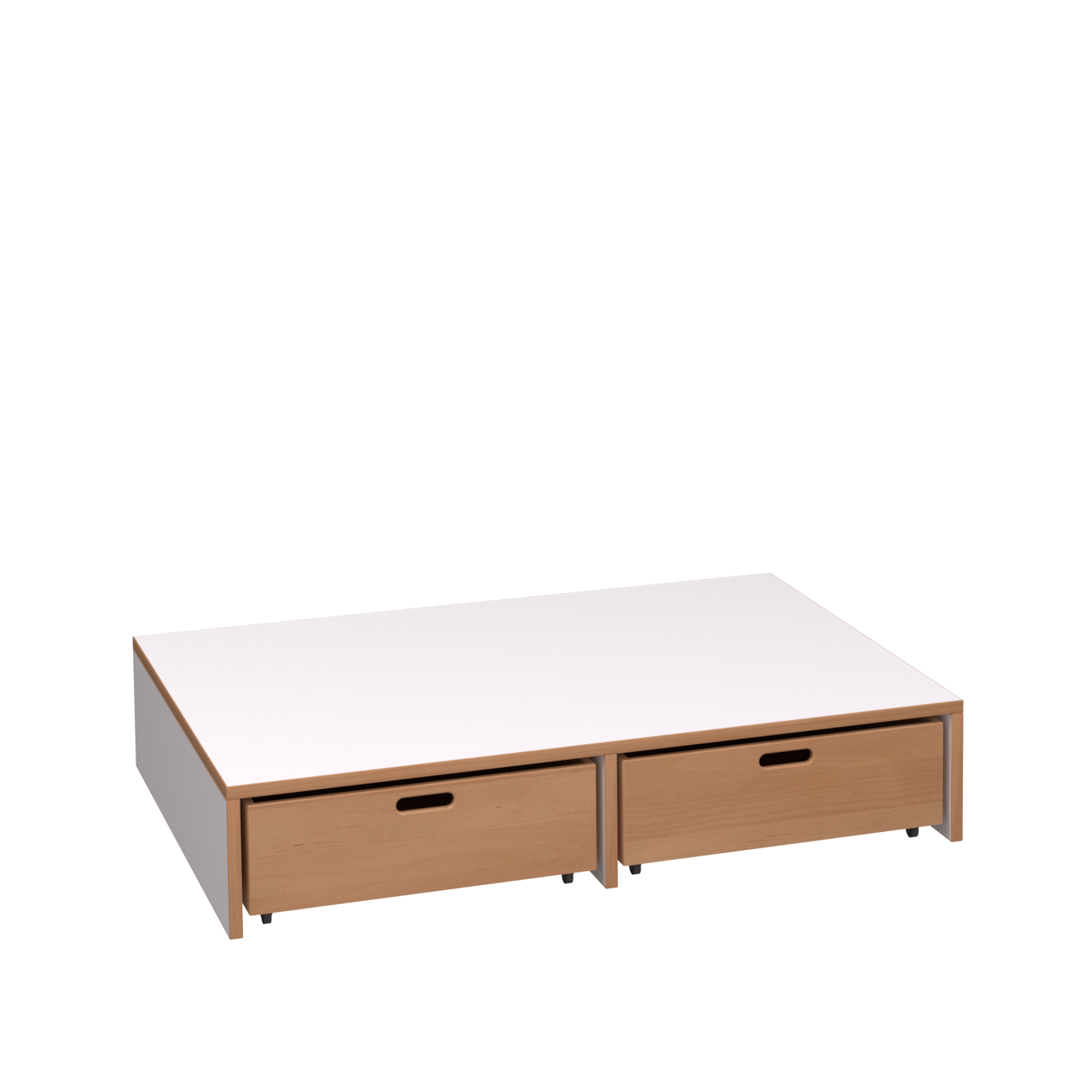 Ordnung leicht gemacht: Unter dem Doppelpodest befinden sich zwei geräumige Rollkisten. Sie bieten reichlich Platz und fassen sogar große Bilderbücher bis zum Format DIN A2. Nach der Lesezeit ist so schnell alles wieder aufgeräumt und die Ecke wirkt stets einladend.