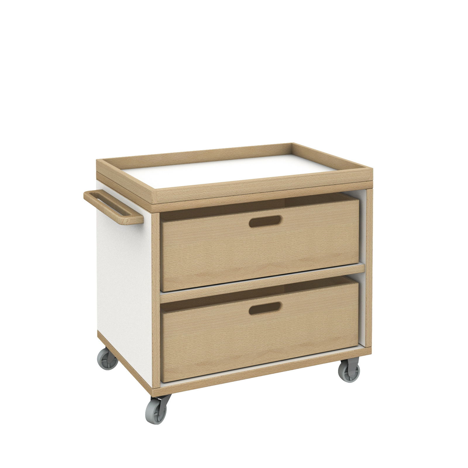 Sein durchdachtes Design verbindet Funktionalität mit einer hochwertigen, natürlichen Optik. Die Kombination aus pflegeleichten, weißen Flächen und warmen Akzenten aus massiver Buche sorgt dafür, dass sich der Wagen harmonisch in jede Raumsituation einfügt. Dank der vier feststellbaren Lenkrollen lässt er sich kinderleicht navigieren und steht doch sicher und fest, sobald er seinen Bestimmungsort erreicht hat. Der DECOR Materialwagen ist mehr als nur ein Aufbewahrungsmöbel; er ist ein organisatorischer Begleiter, der Arbeitsabläufe erleichtert und Ordnung schafft, wo sie gebraucht wird.