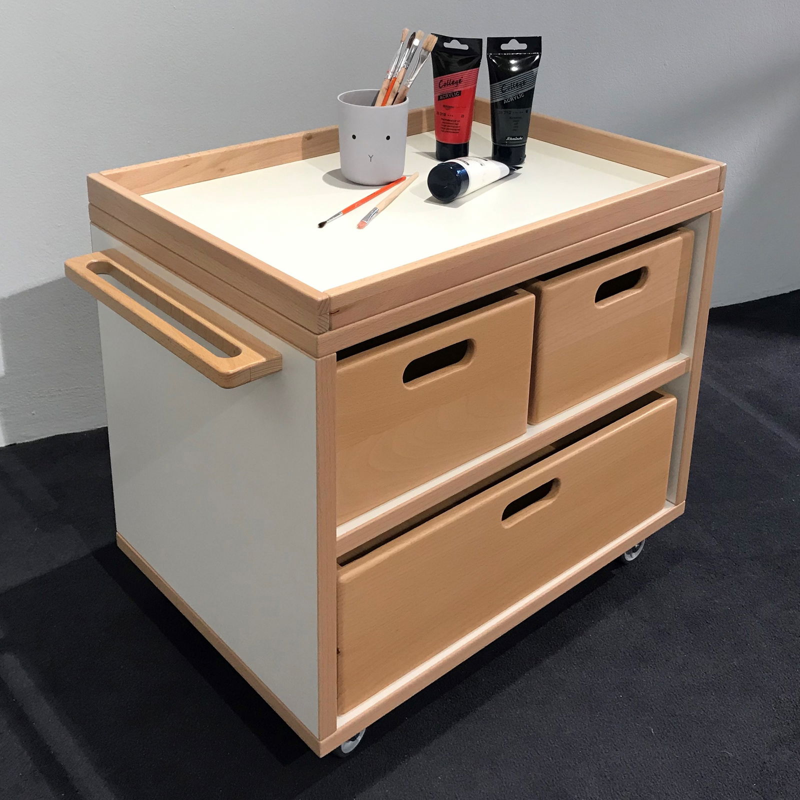 Die obere Deckplatte ist mit einem Rahmen aus massiver Buche versehen. Dieser verhindert zuverlässig, dass Gegenstände wie Stifte, Becher oder kleine Spielzeuge beim Schieben herunterfallen. So bleibt alles sicher an seinem Platz, auch wenn es mal etwas schneller gehen muss. - Flexibel konfigurierbar mit Stauraum