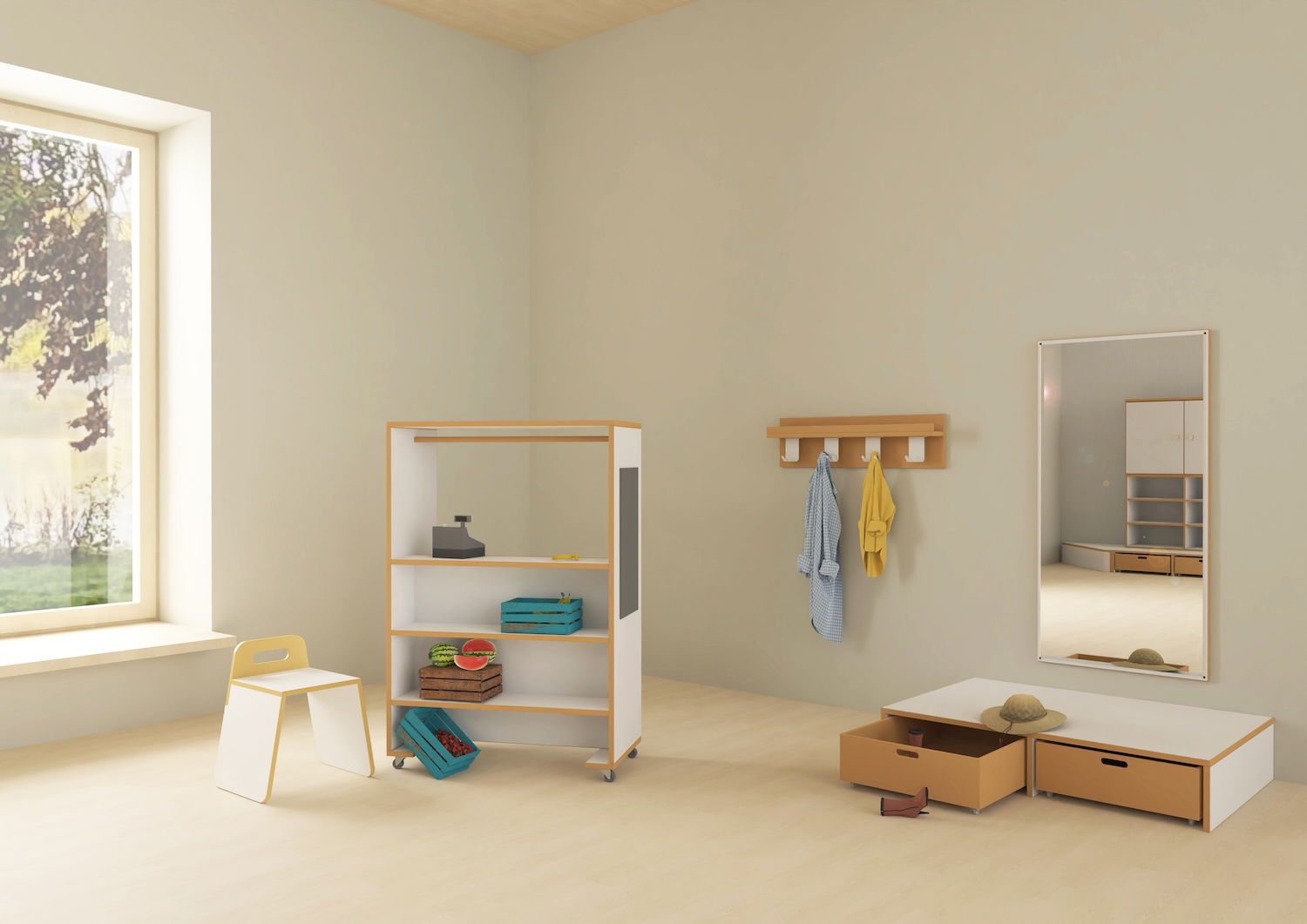 Im Gegensatz zu fest vorgegebenen Themenmöbeln zeichnet sich dieses Set durch seine bewusste Neutralität aus. Das mobile Rollenspielmodul inklusive Stapelhocker ist so gestaltet, dass es sich durch die Fantasie der Kinder immer wieder verwandeln kann: Mal ist es ein Kaufladen, mal ein Bankschalter, ein Büro oder ein Puppentheater. Ergänzt wird das Ensemble durch ein flaches Doppelpodest, das als Bühne dient, sowie einen großen Spiegel und eine Garderobenleiste. Hier können Kinder sich verkleiden, betrachten und ihre Stücke direkt aufführen.