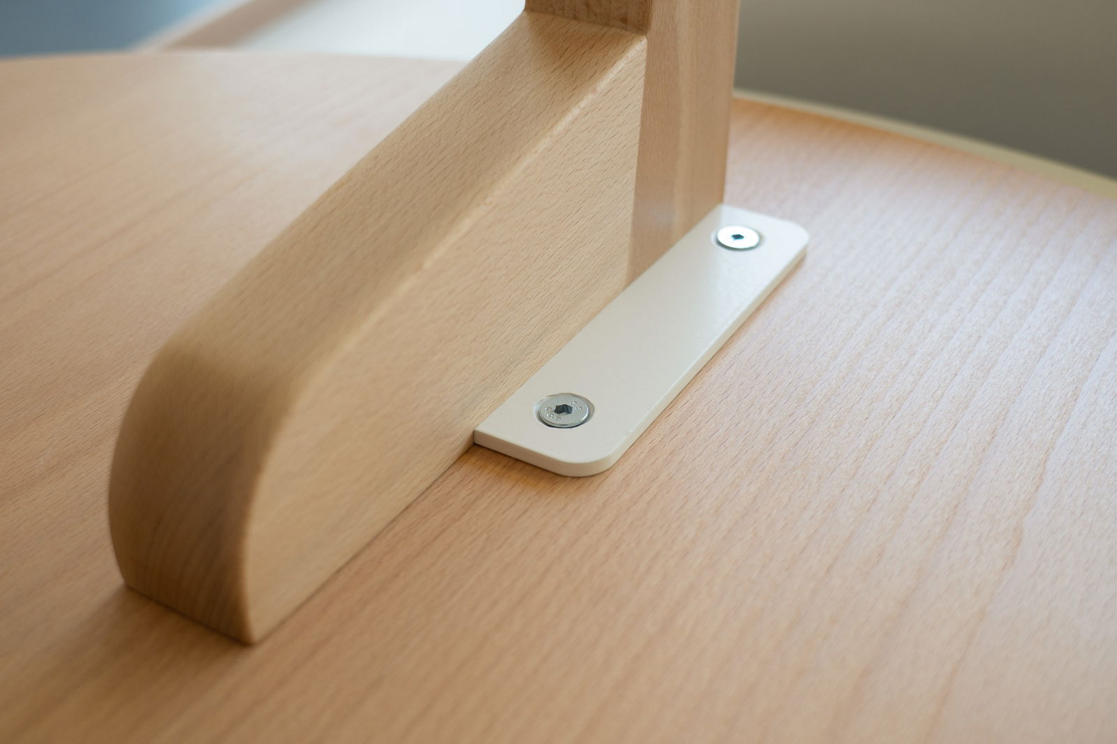 Die Konstruktion verzichtet bewusst auf eine umlaufende Zarge (Rahmen) unter der Tischplatte. Die massiven Buchenbeine sind direkt und stabil mit der Platte verbunden. Das Ergebnis: Viel Platz für Kinderbeine und die Möglichkeit, Stühle mit Armlehnen (wie den Wandelstuhl) problemlos unterzuschieben. - Ein Tisch, der mitwächst
