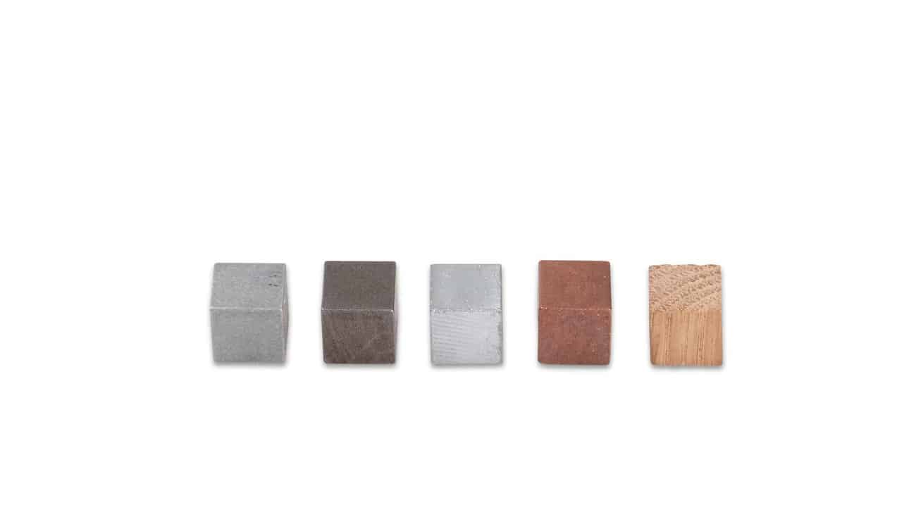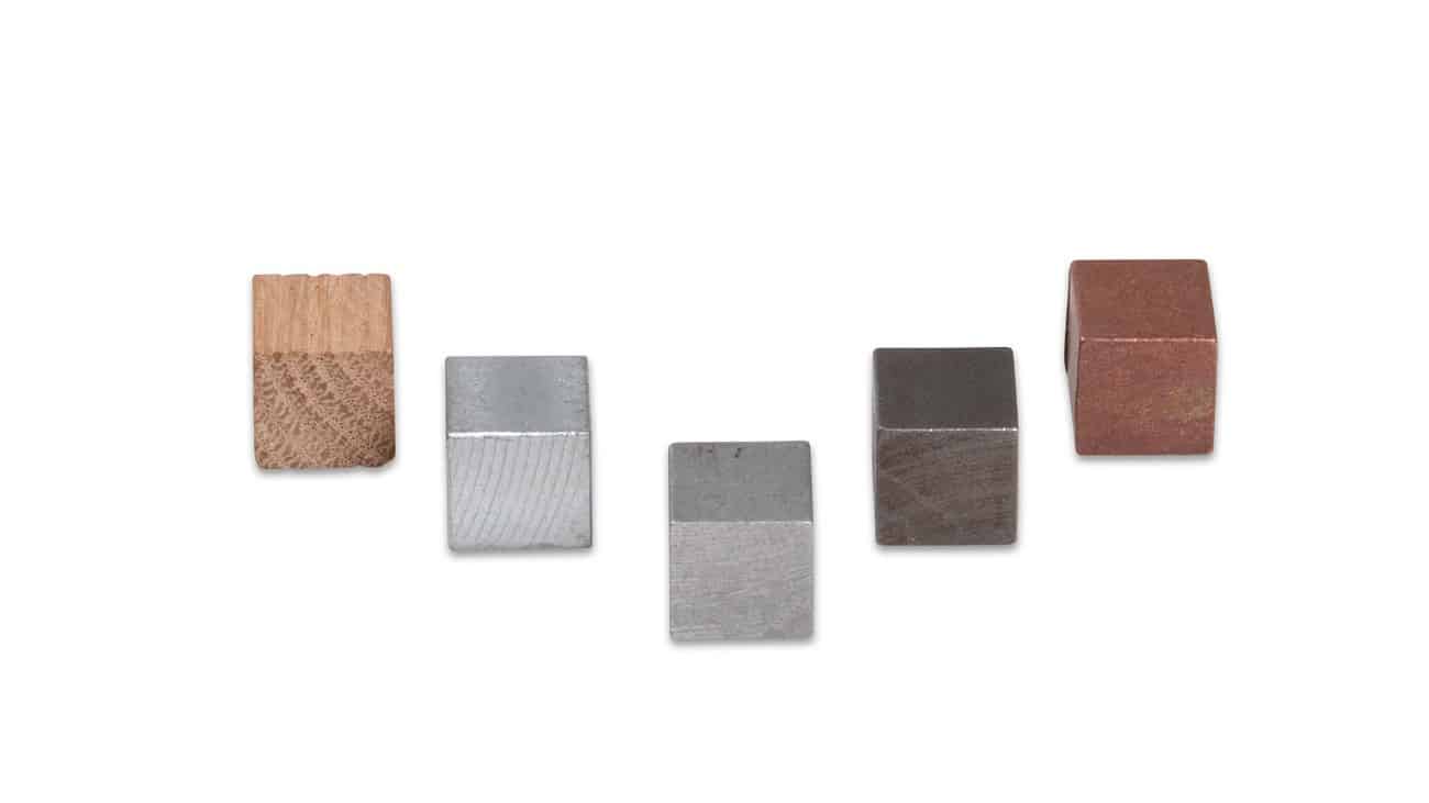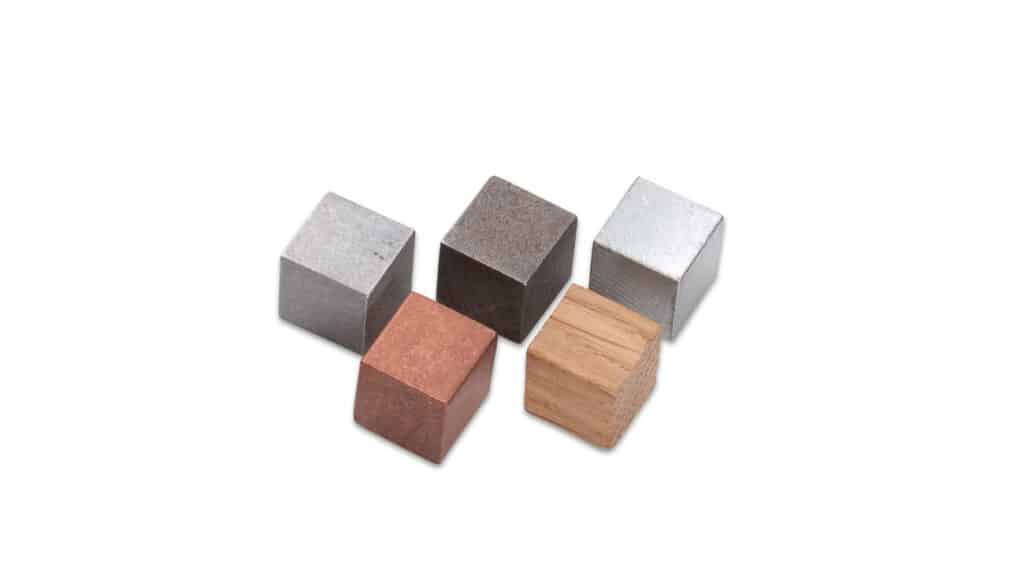 - Würfelmaterialien: Aluminium, Zink, Messing, Eisen, Holz