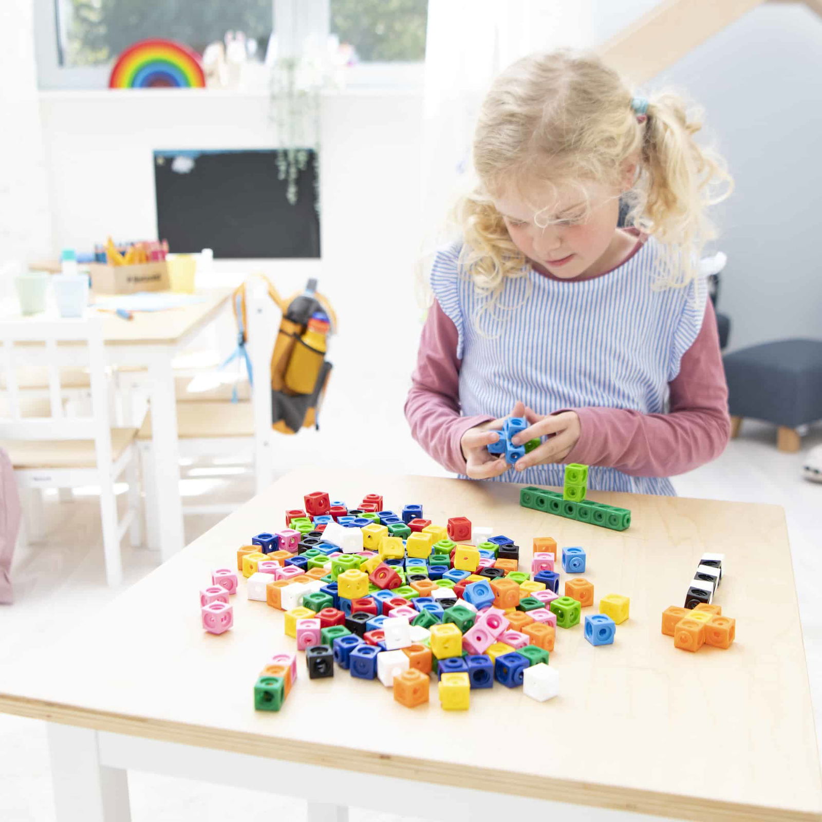 Die verschiedenen Farben der Würfel helfen den Kindern nicht nur beim Zählen, sondern fördern auch die visuelle Wahrnehmung und die Unterscheidung von Mengen. Ob zum Zählen, für kleine Rechenoperationen oder zum Konstruieren von geometrischen Formen – die Verwendung der Steckwürfel bringt Vielfalt in den Mathematikunterricht.