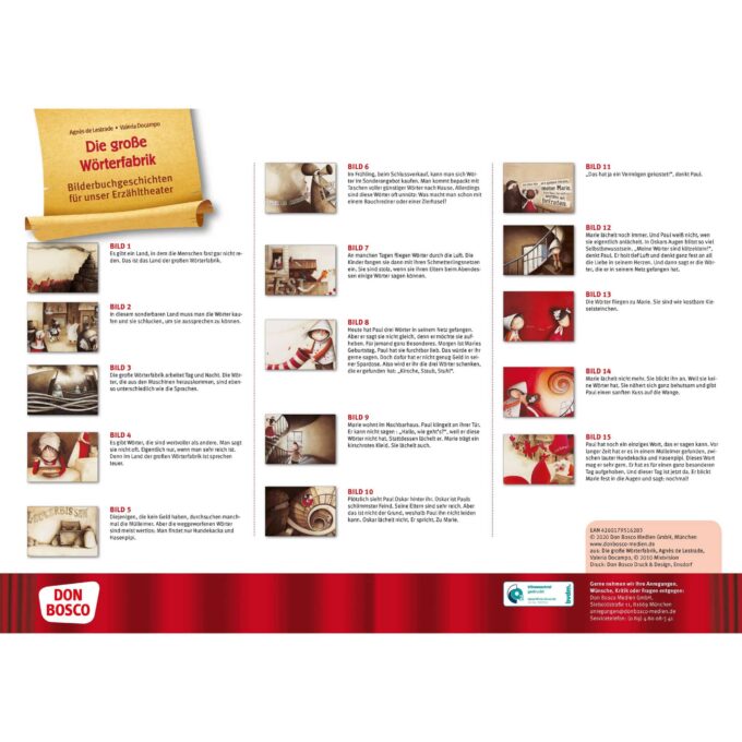 Willkommen zum Kamishibai-Bildkartenset „Die große Wörterfabrik“! Dieses liebevoll gestaltete Set besteht aus 16 eindrucksvoll illustrierten Bildkarten, die Kinder ab 4 Jahren in die poetische und gefühlvolle Geschichte von Paul und Marie einführen. Perfekt geeignet für das Kamishibai-Erzähltheater, lernen Ihre Kinder, wie man mit Wörtern Emotionen ausdrücken kann und warum schöne Wörter manchmal kostbarer sind als Edelsteine.