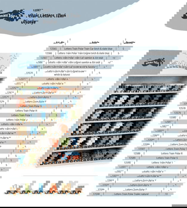 Alle einsteigen zur kreativsten Buchstabenreise des Jahres! Das fertig bestückte, 180-teilige Display „Buchstabenzug Polar“ von small foot ist der perfekte Startpunkt für personalisierte Geschenke und zauberhafte Kinderzimmer-Dekorationen. Mit diesem Set, bestehend aus Lokomotiven, Waggons und allen Buchstaben des Alphabets in stilvollen, gedeckten Polarfarben, lassen sich individuelle Namen, Kosenamen oder ganze Wörter spielend leicht zusammenstellen. Die Kombination aus naturbelassenem Holz und modernem Design macht jeden einzelnen Buchstabenwaggon zu einem kleinen Schmuckstück. Ob als Lernhilfe für die ersten Buchstaben, als wunderschönes Geschenk zur Geburt oder als Highlight im eigenen Verkaufsregal – dieser Buchstabenzug begeistert Kinder und Erwachsene gleichermaßen.