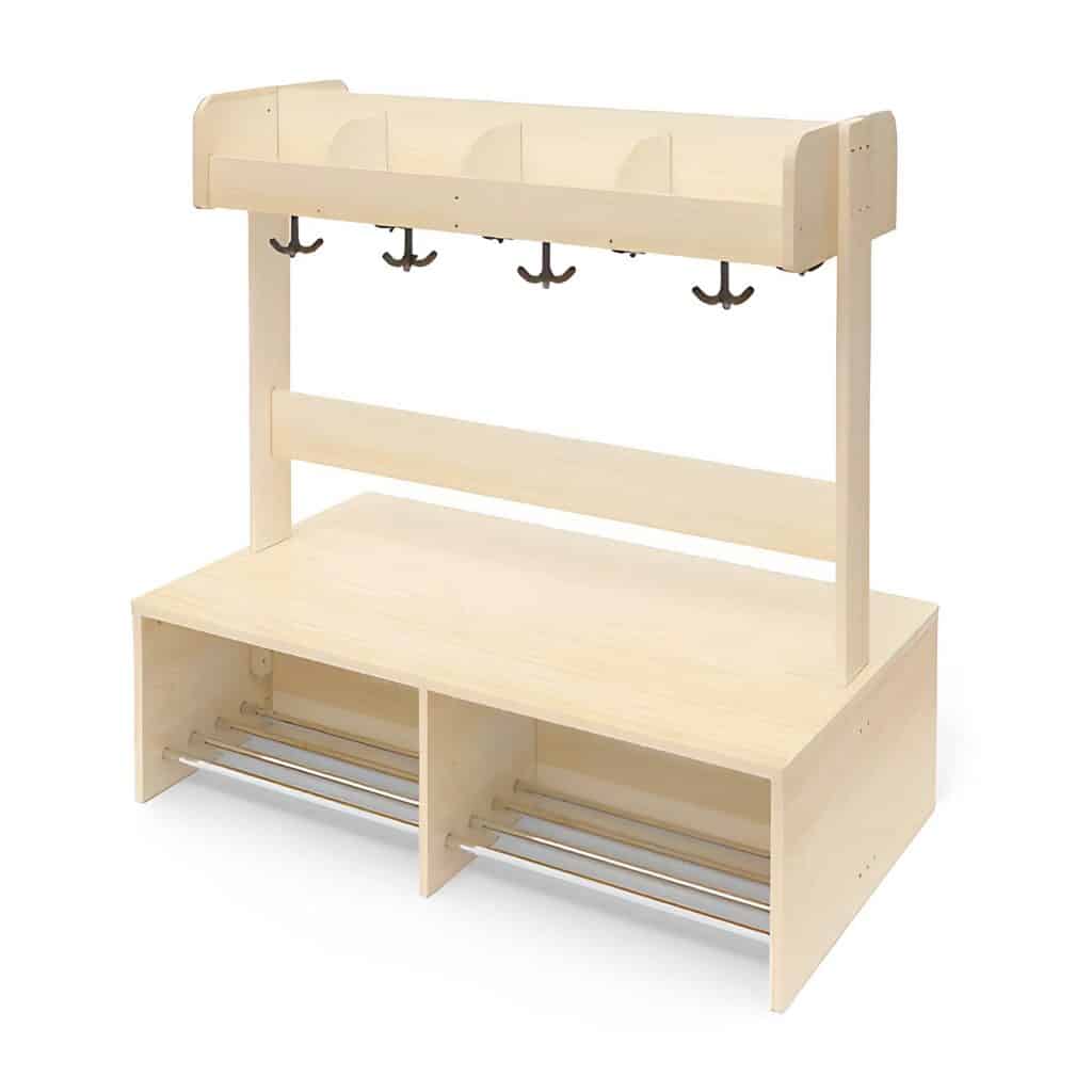 Jeder der acht Plätze ist durchdacht und voll ausgestattet. Ein oberes Ablagefach bietet reichlich Platz für Mützen, Handschuhe oder persönliche Schätze. Darunter sorgt ein robuster Haken für den sicheren Halt von Jacken und Taschen. Der integrierte Schuhrost am Boden stellt sicher, dass Schuhe ordentlich aufgereiht und gut belüftet werden können. Dieses All-in-One-System fördert die Selbstständigkeit und den Ordnungssinn der Kinder auf intuitive Weise. - Fördert einen ruhigen und organisierten Ablauf
