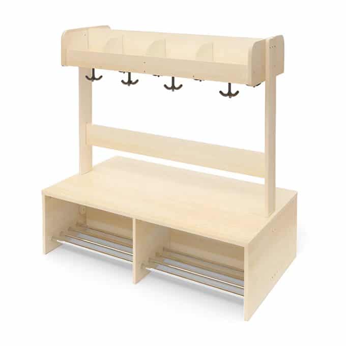 Das doppelseitige Design ist der Schlüssel zu unübertroffener Raumeffizienz. Auf einer Grundfläche von nur 120 x 69 cm finden acht Kinder einen kompletten Garderobenplatz. Vier Plätze auf der Vorderseite und vier auf der Rückseite ermöglichen eine hohe Auslastung, ohne wertvolle Wandfläche zu blockieren. Ideal für große Gruppen oder als zentrale Anlaufstelle in der Mitte eines Raumes. - Ein kompletter, persönlicher Bereich für jedes Kind