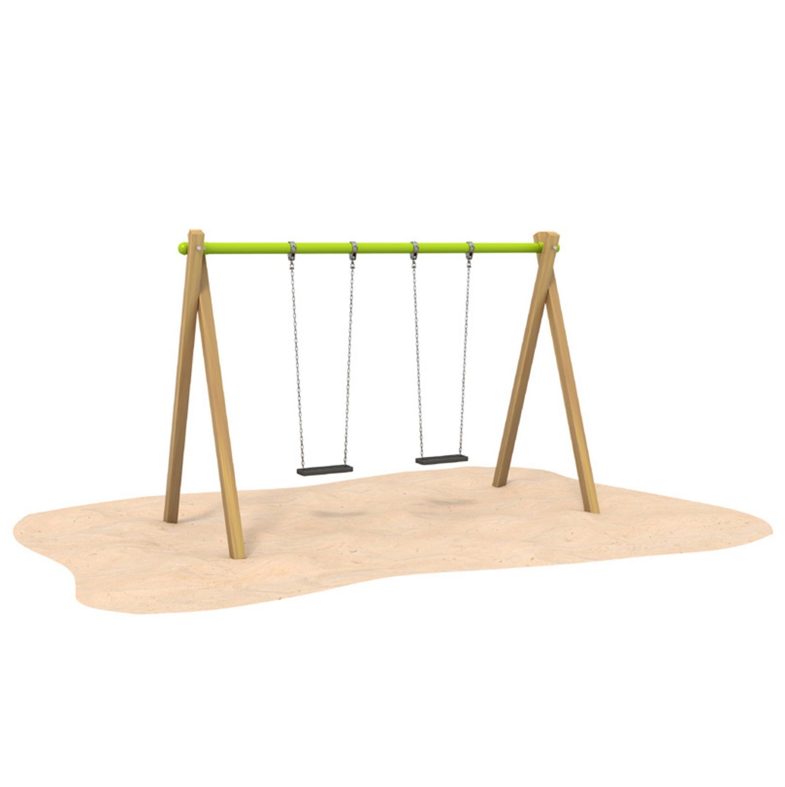 Moderne Doppelschaukel von WISDOM mit Holzpfosten in Limette. EN 1176 zertifiziert, für 2 Schaukelsitze. Robust, sicher & ideal für naturnahe Spielplätze.