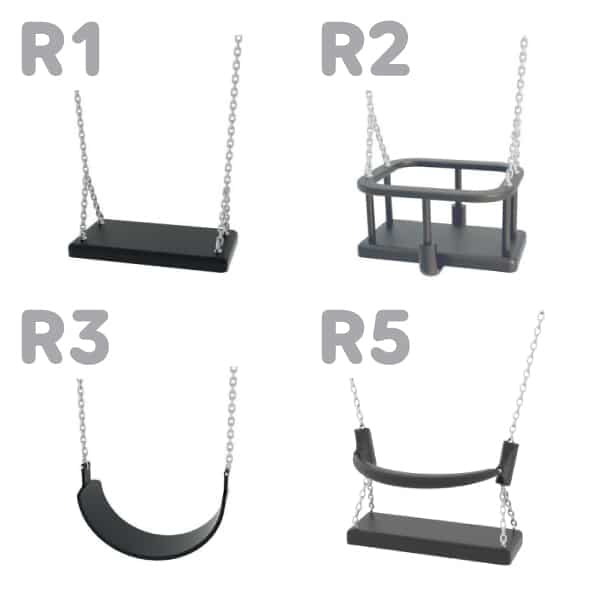 R1 flache Schaukel, R2 Babysitz, R3 Gurtsitz, R5L flache Schaukel mit Lehne, R16 Sitz für Mutter & Kind