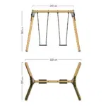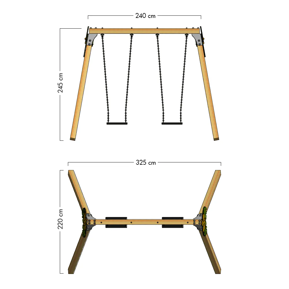 Da Holz ein Naturprodukt ist und sein Volumen durch Trocknung oder Feuchtigkeitsaufnahme verändern kann, empfehlen wir, einige Holzelemente selbst zu bohren, um Passgenauigkeit sicherzustellen. Diese Doppelschaukel ist nicht für Kinder unter 3 Jahren geeignet und sollte stets unter unmittelbarer Aufsicht von Erwachsenen verwendet werden. Bitte beachten Sie, dass die angegebenen Maße und Farben geringfügig abweichen können.