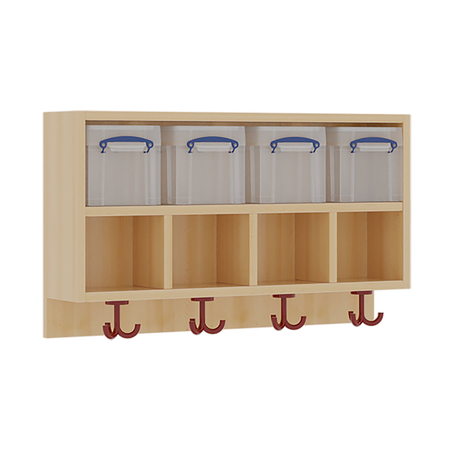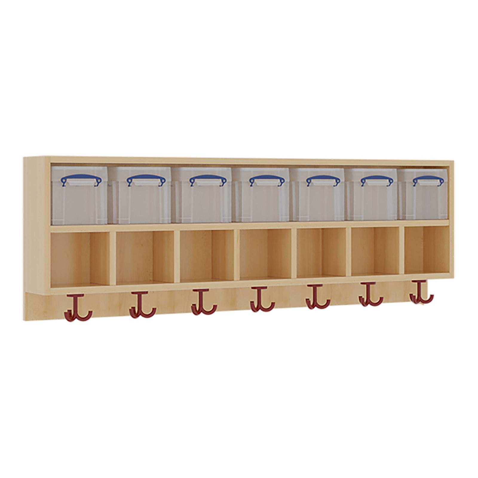 • Ausstattung pro Platz: 1 Kunststoffbox mit Deckel (oben), 1 offenes Fach (ca. 15 cm hoch), 1 farbiger 3fach-Kleiderhaken (unten)