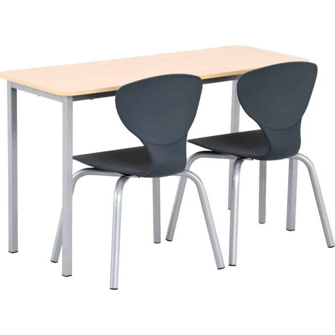 Dieses Set kombiniert Funktion und Ästhetik. Der Doppeltisch Vorte bietet genügend Platz für zwei Personen und ist ideal geeignet für schulische und berufliche Umgebungen. Die abgerundeten Ecken sorgen für Sicherheit, während die alufarbene und Ahorn-Oberfläche dem Raum eine elegante Note verleiht.