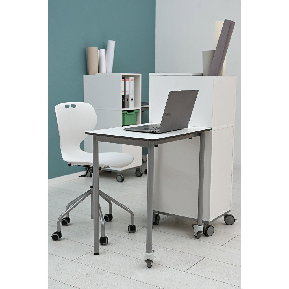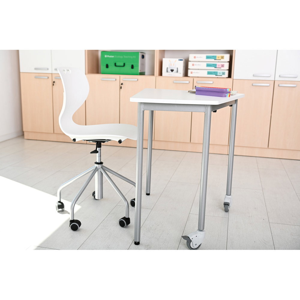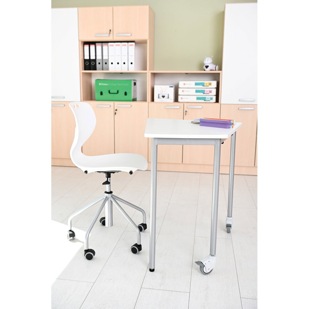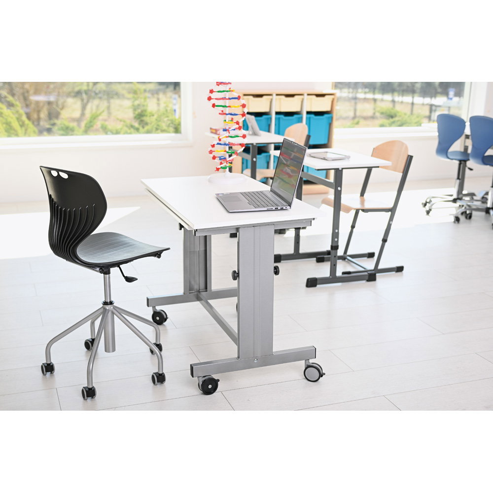 Gruppenarbeiten und wechselnde Unterrichtsformen verlangen nach flexiblen Raumkonzepten. Das stabile, alufarbene Metallgestell ist mit einem großzügigen Fußkreuz (Durchmesser 59 cm) und fünf leichtgängigen Rollen ausgestattet. Diese sorgen nicht nur für die nötige Mobilität im Raum, sondern garantieren auch eine unübertroffene Kippsicherheit und einen festen Stand an jedem Arbeitsplatz. - Robuste und extrem pflegeleichte Materialien
