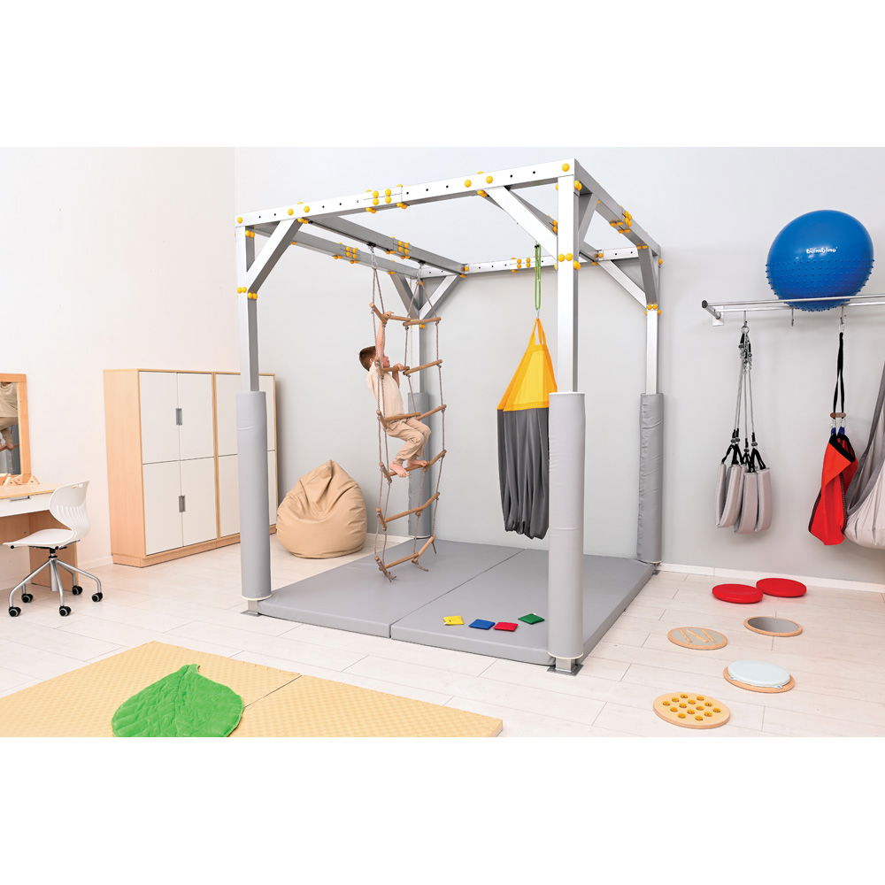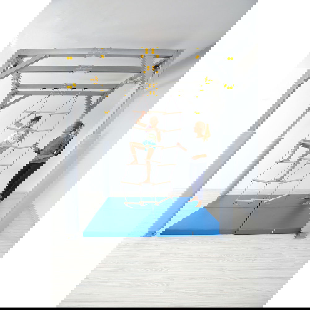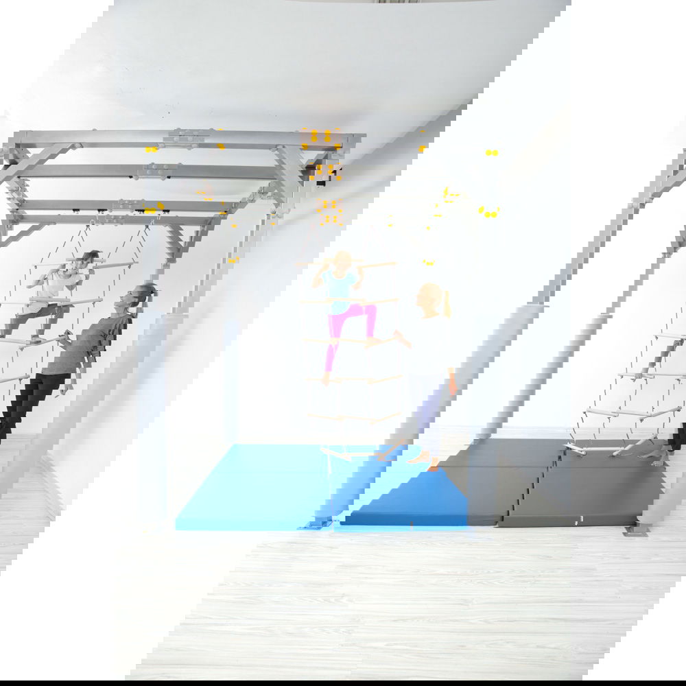 Kinder wachsen und entwickeln stetig neue körperliche Fähigkeiten. Um diesen Fortschritt optimal zu begleiten, bietet die Dreifach-Strickleiter eine herausfordernde und zugleich sichere Trainingsmöglichkeit für die sensorische Integrationstherapie. Sie ist gezielt auf die Bedürfnisse größerer Kinder abgestimmt und fügt sich nahtlos in unser bewährtes SI-Therapiezentrum (092994PU) ein. Klettern fordert den gesamten Körper. Wenn Kinder die Sprossen erklimmen, trainieren sie intensiv ihre motorischen Fähigkeiten, ihre Koordination und ihren Gleichgewichtssinn. Die dreifache Ausführung der Strickleiter erweitert den Bewegungsspielraum dabei enorm. Sie ermöglicht es den Heranwachsenden, nicht nur vertikal in die Höhe zu steigen, sondern auch horizontal zwischen den Leitersträngen zu navigieren. Das stärkt die Muskulatur und fördert die räumliche Orientierung auf ganz natürliche Weise.
