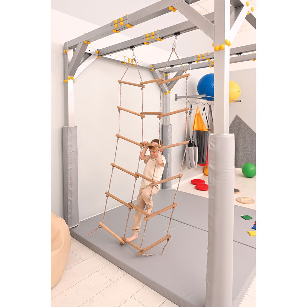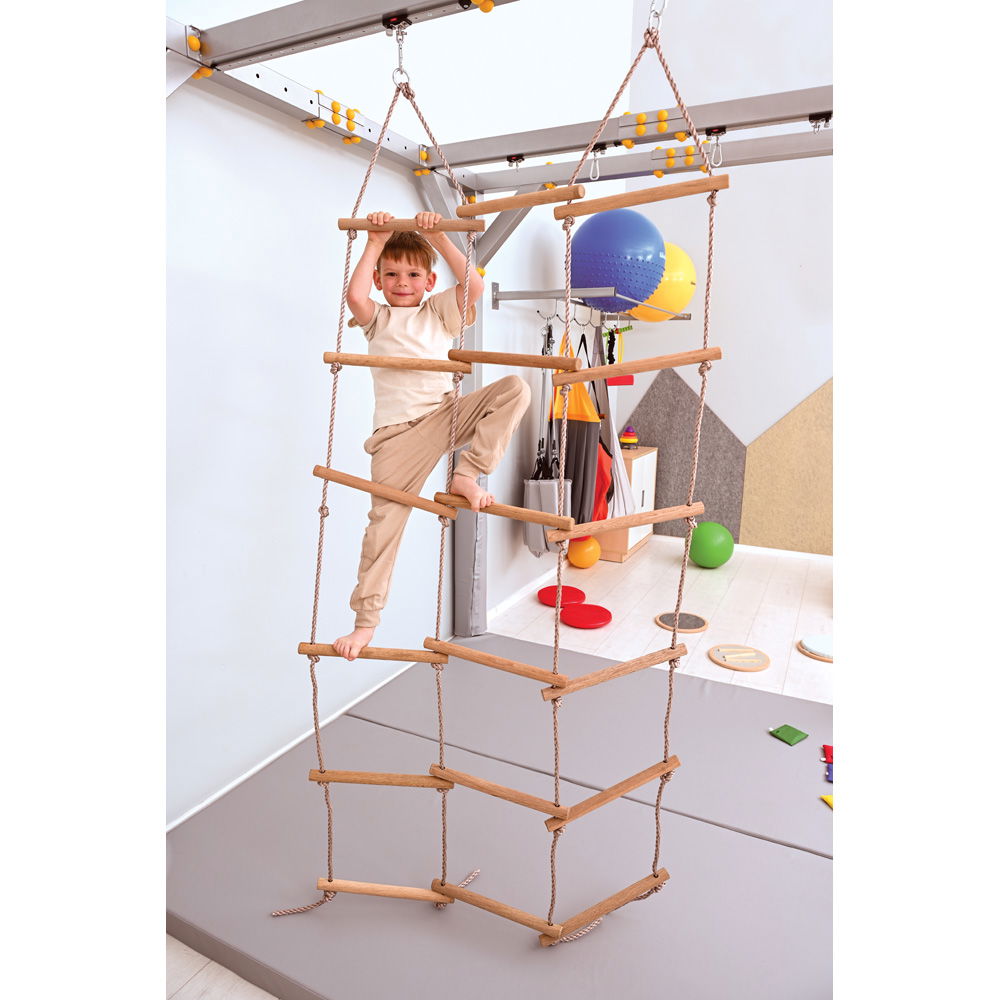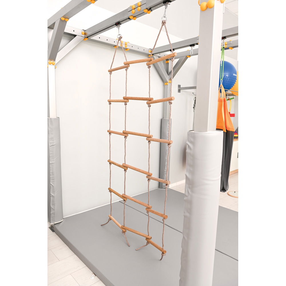 Therapeuten schätzen besonders die Vielseitigkeit dieses Geräts. Es lässt sich für strukturierte, therapeutische Übungen ebenso nutzen wie für freies, kreatives Spiel. Die Montage im Therapiezentrum gestaltet sich zudem äußerst unkompliziert. Sie benötigen für die Befestigung keinerlei zusätzliche Materialien. Die Strickleiter wird einfach an den vorhandenen Karabinerhaken der Anlage eingehängt und ist sofort einsatzbereit. So bleibt Ihnen mehr wertvolle Zeit für die eigentliche Förderung und das gemeinsame Erleben mit den Kindern.