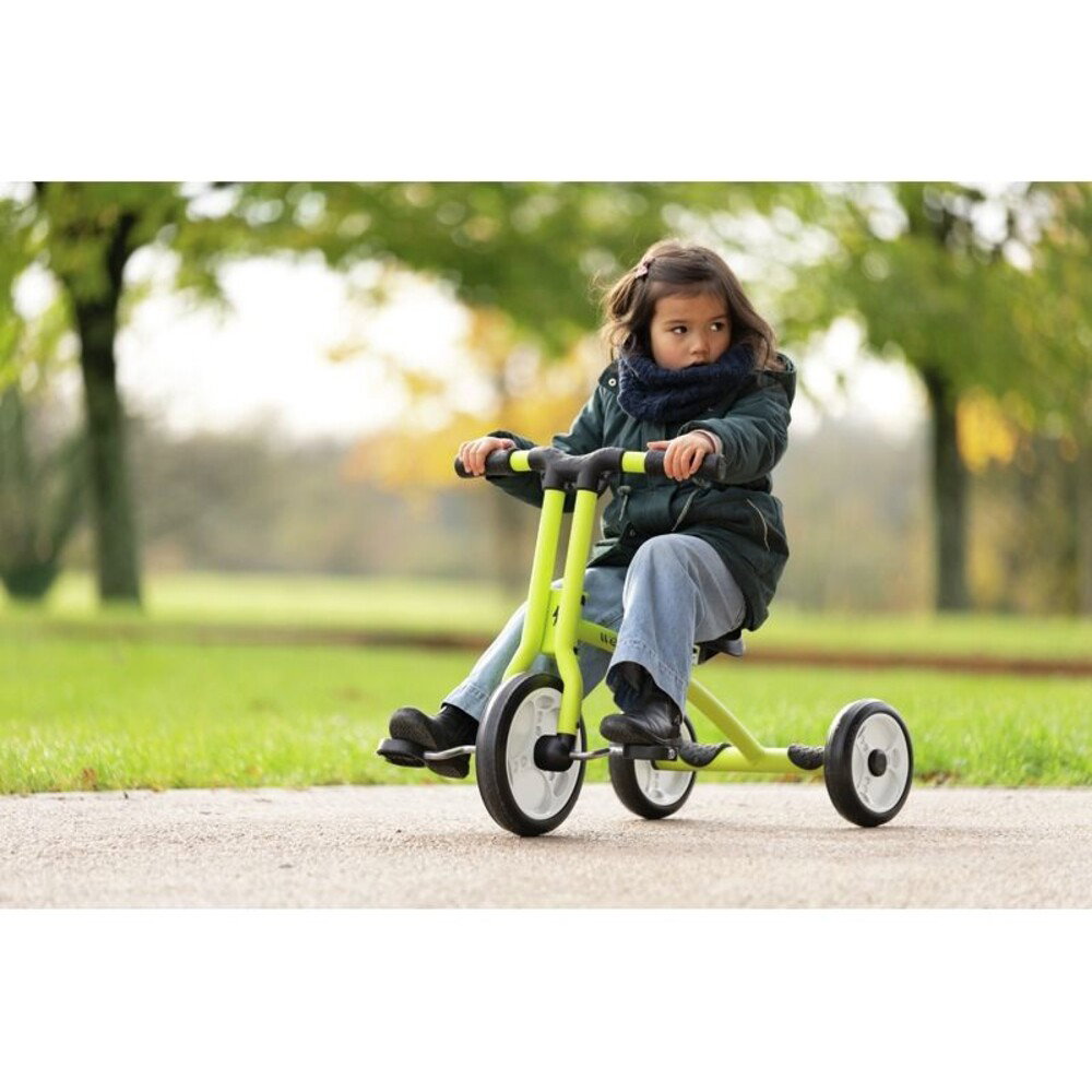 Die Konstruktion dieses Dreirads ist speziell auf die hohen Anforderungen im Betreuungsalltag und für die intensive Nutzung ausgelegt. Der äußerst robuste Rahmen und die Gabel bestehen aus verstärkten, gebogenen Stahlrohren. Diese durchdachte Bauweise verleiht dem Fahrzeug nicht nur eine außergewöhnliche Steifigkeit, sondern bietet den kleinen Fahrern auch einen hohen ergonomischen Komfort. Der neigbare Sattel lässt sich optimal an die individuelle Körperform und Sitzposition des Kindes anpassen. Pannensichere Vollräder, die besonders abriebfest sind, garantieren ein sorgenfreies und langlebiges Fahrerlebnis, egal auf welchem Untergrund die Kinder unterwegs sind.
