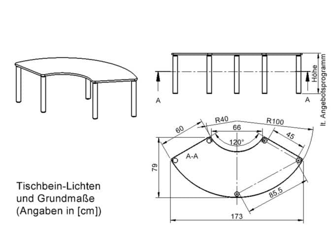 - Tischplatte: 173 x 80 cm (Drittelkreis)