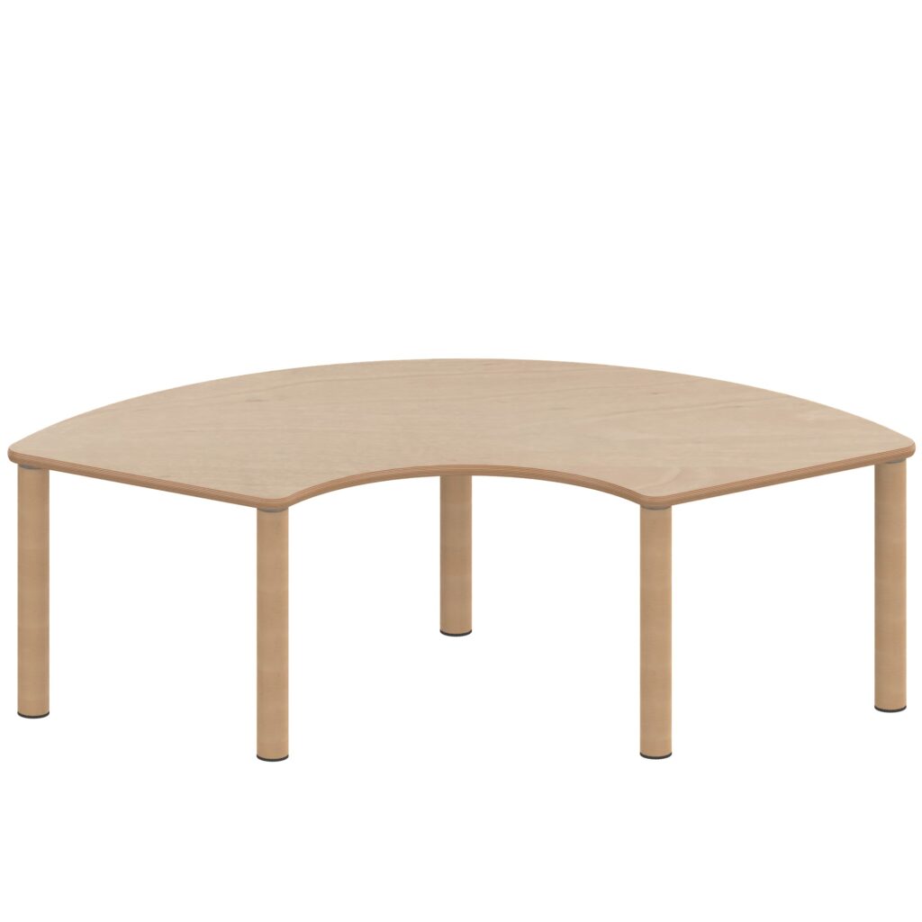 Der Drittelkreistisch ZALOTTI 173×80 cm mit Schichtstoff-Belag und Massivholzbeinen revolutioniert moderne Arbeits- und Lernräume durch seine einzigartige Verbindung von innovativer Drittelkreis-Geometrie und natürlicher Ausstrahlung. Diese außergewöhnliche zargenlose Tischkonstruktion mit unzerstörbarem 0,8 mm HPL-Schichtstoffbelag und robusten Buche-Massivholzbeinen schafft die ideale Atmosphäre für kreative Gruppenarbeit und flexible Kommunikation. Die besondere Drittelkreis-Form mit 173×80 cm Grundfläche ermöglicht völlig neue Raumarrangements bei gleichzeitig komfortablem Arbeitsplatz für größere Gruppen oder kombinierte Anordnungen. Die zargenlose Bauweise mit fünf stabilen Beinen bietet ungehinderte Beinfreiheit für alle Nutzer – auch für Rollstuhlfahrer. Mit acht verfügbaren Höhen von 25 bis 76 cm wächst dieser „Made in Germany“ Qualitätstisch flexibel mit den Anforderungen mit und schafft durch seine natürliche Holzoptik eine warme, einladende Arbeitsatmosphäre für kreatives Lernen, konzentrierte Teamarbeit oder innovative Besprechungsformate.