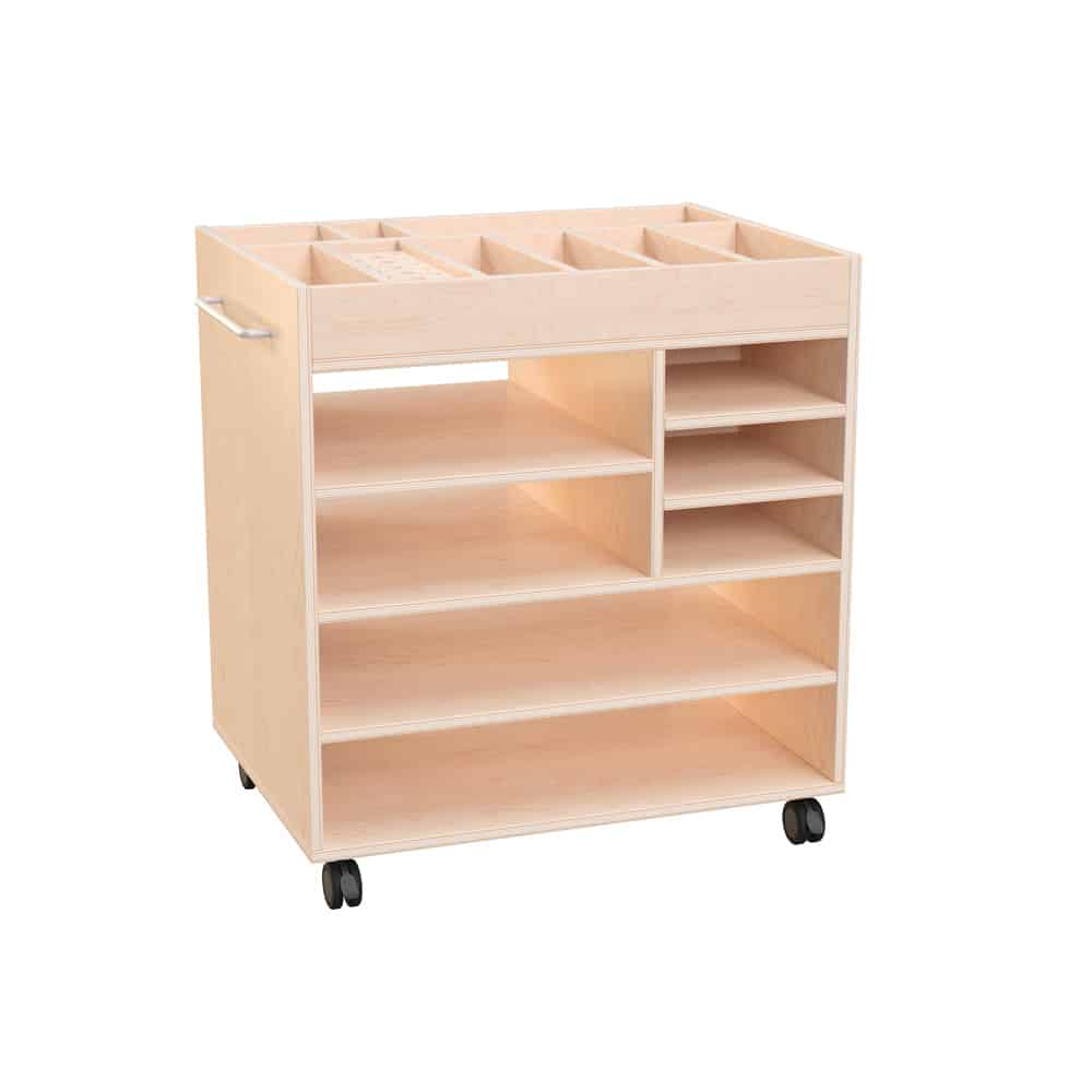 Mit seinen zahlreichen, teils verstellbaren Fächern bietet der Echtholz Bastelwagen vielseitige AufbewahrungsmĂśglichkeiten fĂźr Bastelmaterialien aller Art. Durchgängige Fächer unten eignen sich ideal fĂźr groĂe Papierformate bis A2, während die verschiedenen oberen Fächer und Pinselständer eine organisierte und griffbereite Aufbewahrung von Materialien ermĂśglichen.