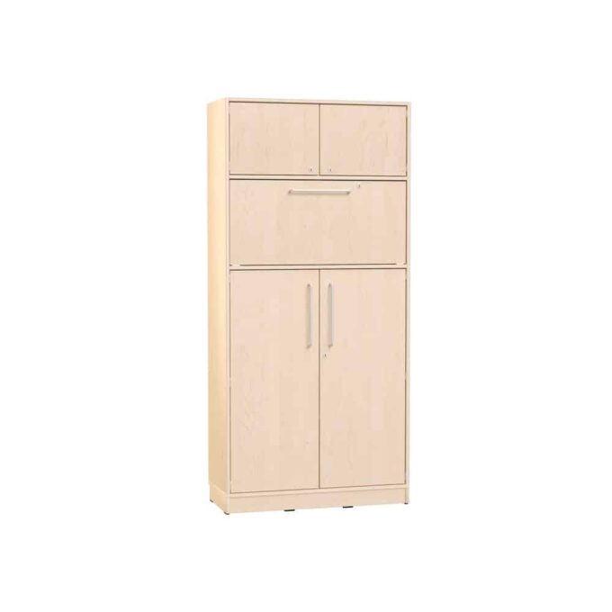 Der Echtholz Hochschrank mit Steharbeitsplatz vereint funktionelles Design und edle Ästhetik. Ideal für Kindergärten, Schulen und Büros, schafft er eine effiziente Arbeitsumgebung mit ausreichend Stauraum für Ihre Unterlagen.