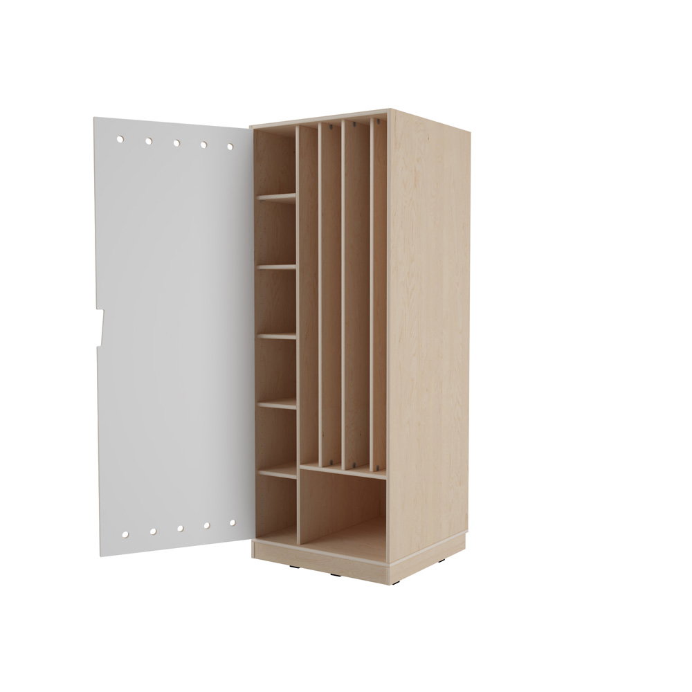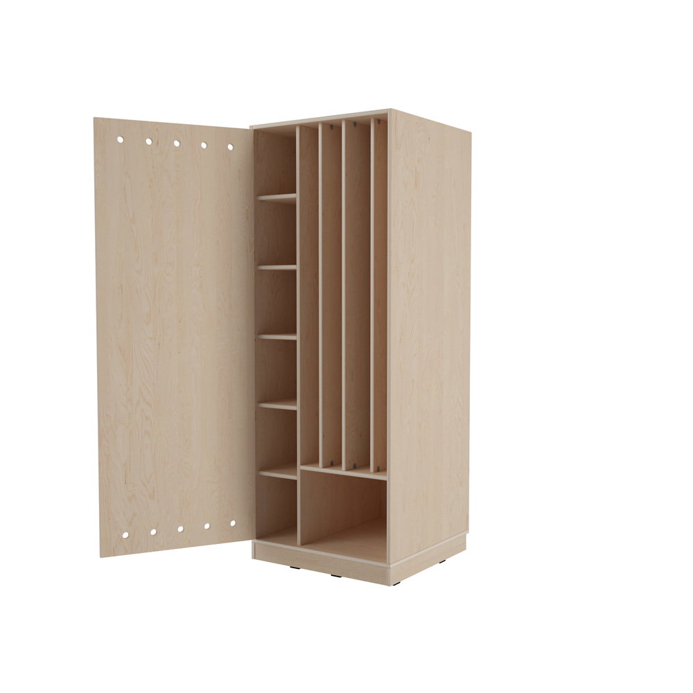 Ein aufgeräumter und harmonisch gestalteter Ruheraum ist entscheidend für erholsame Pausen im lebhaften Alltag von Kindergarten und Schule. Wenn Liegepolster und Decken ihren festen, sauberen Platz haben, entsteht eine Atmosphäre der Ruhe, die Kinder zum Entspannen einlädt. Der Echtholz Kombischrank für vier Matten wurde speziell für kleinere Gruppen oder Räume mit begrenztem Platzangebot entwickelt. Mit seiner schlanken Bauweise und der durchdachten Fächeraufteilung sorgt er für maximale Ordnung auf minimaler Fläche. Gefertigt aus hochwertigem Echtholz, bringt dieses Möbelstück eine natürliche Wärme und zeitlose Ästhetik in Ihre Einrichtung.