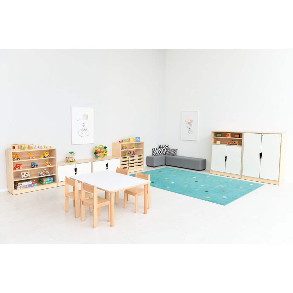 - Einlegeböden: Durchgängig verstellbar, ausgenommen der fest montierte Boden auf 86 cm. Mit Zusatzböden (098552) erweiterbar