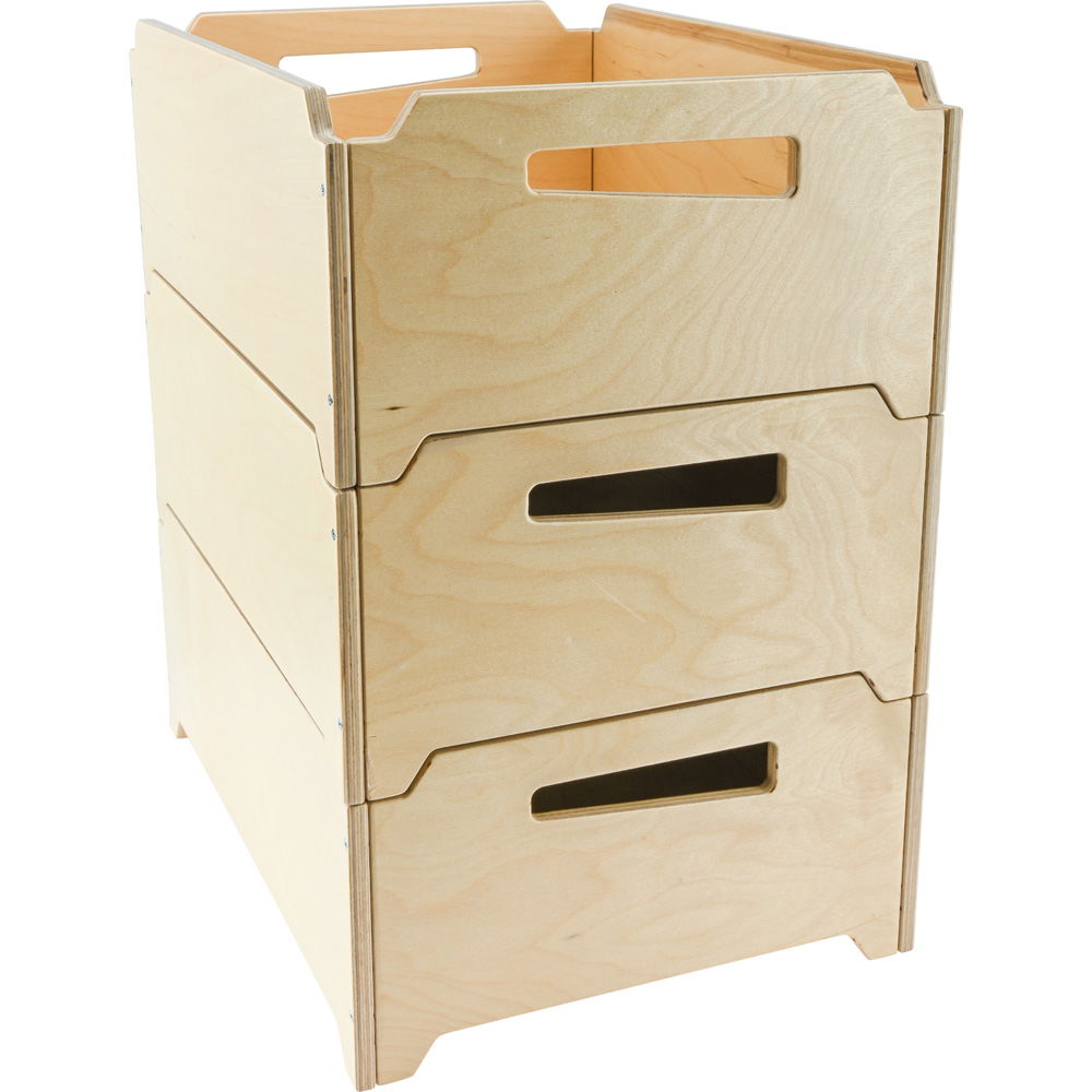 Die spezielle Konstruktion, bei der Echtholz-Furniere kreuzweise verleimt werden, verleiht der Box eine außergewöhnliche Festigkeit und Formstabilität. Im Gegensatz zu einfachen Kunststoffboxen hält sie auch schwereren Inhalten stand und ist für den täglichen, intensiven Gebrauch bestens gewappnet. Die lackierte Oberfläche schützt das Holz zusätzlich und macht es pflegeleicht. - Intelligentes und sicheres Stapelsystem