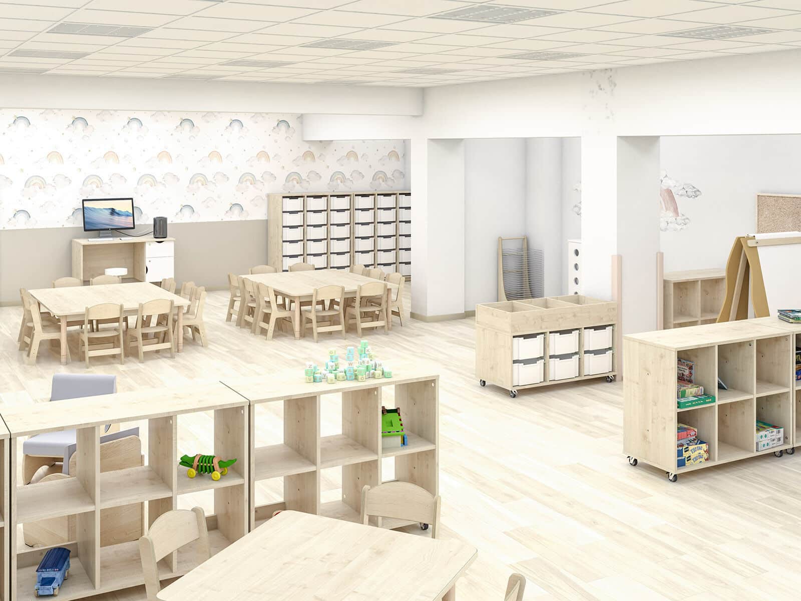 • Harmonische Integration: Das helle Ahorn-Dekor wirkt freundlich und zeitlos. Es lässt sich perfekt mit vielen anderen Möbelkollektionen kombinieren und schafft eine warme, einladende Atmosphäre im Gruppenraum.