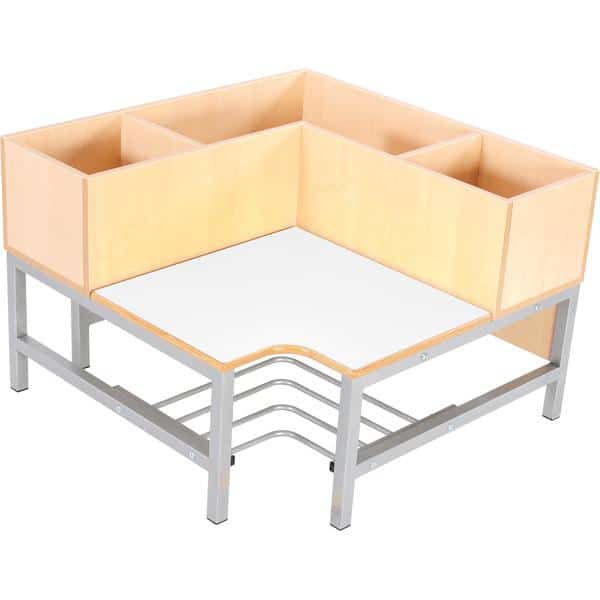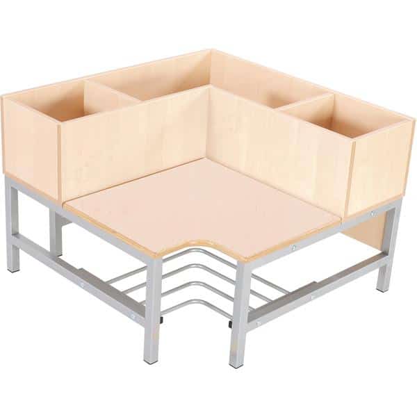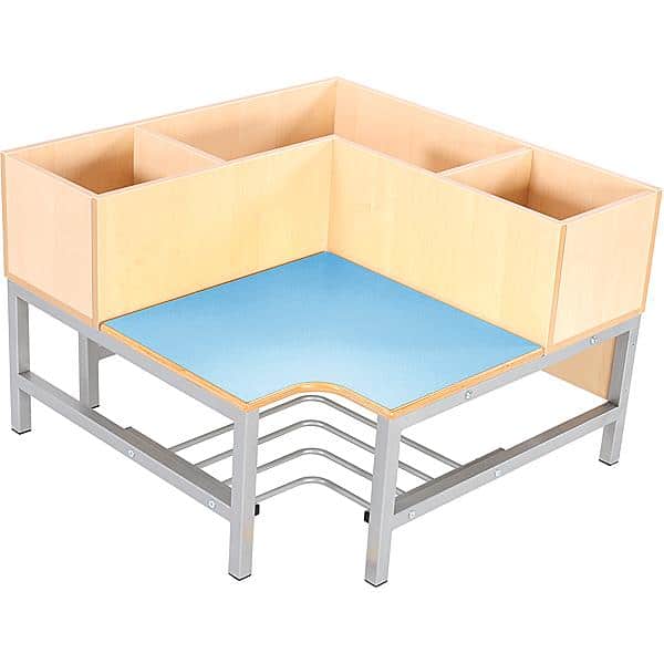 Ecksitzbank aus farbigem HPL-laminiertem Sperrholz (Stärke: 19 mm); Schuhablage mit Gitterrost; Rückenlehne mit 3 Fächern (Innenmaße: 27 x 27 cm, größeres Fach Schenkellänge: 55 cm). Passend zu Regalen 092548 und 092550.