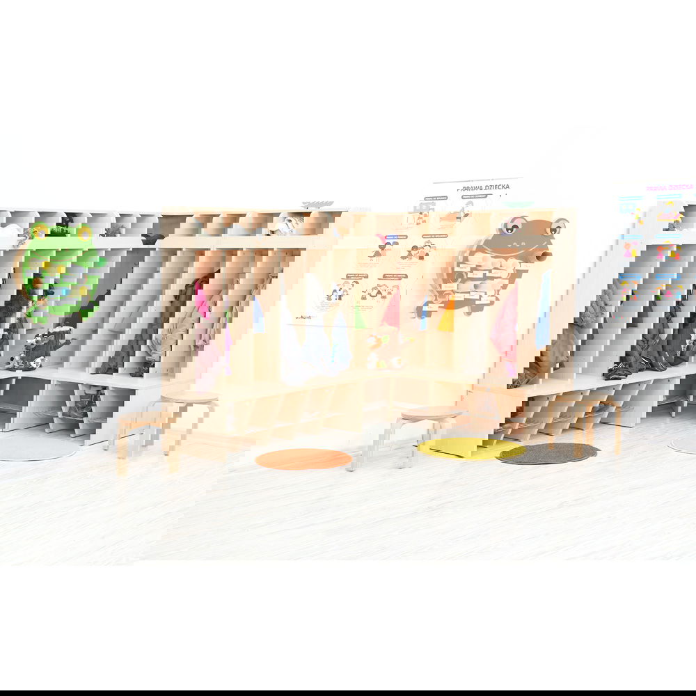 Dieses Möbelstück schafft auf clevere Weise Ordnung für sechs Kinder. Es verwandelt eine leere Ecke in eine voll funktionsfähige Garderobeneinheit, die jedem Kind einen eigenen, klar definierten Platz für Jacke, Schuhe und persönliche Schätze bietet. Die durchdachte Konstruktion mit integrierter Sitzbank und Schuhrost macht die Eckgarderobe zu einem unverzichtbaren Helfer im dynamischen Kita-Alltag und sorgt für strukturierte, aufgeräumte Eingangsbereiche.