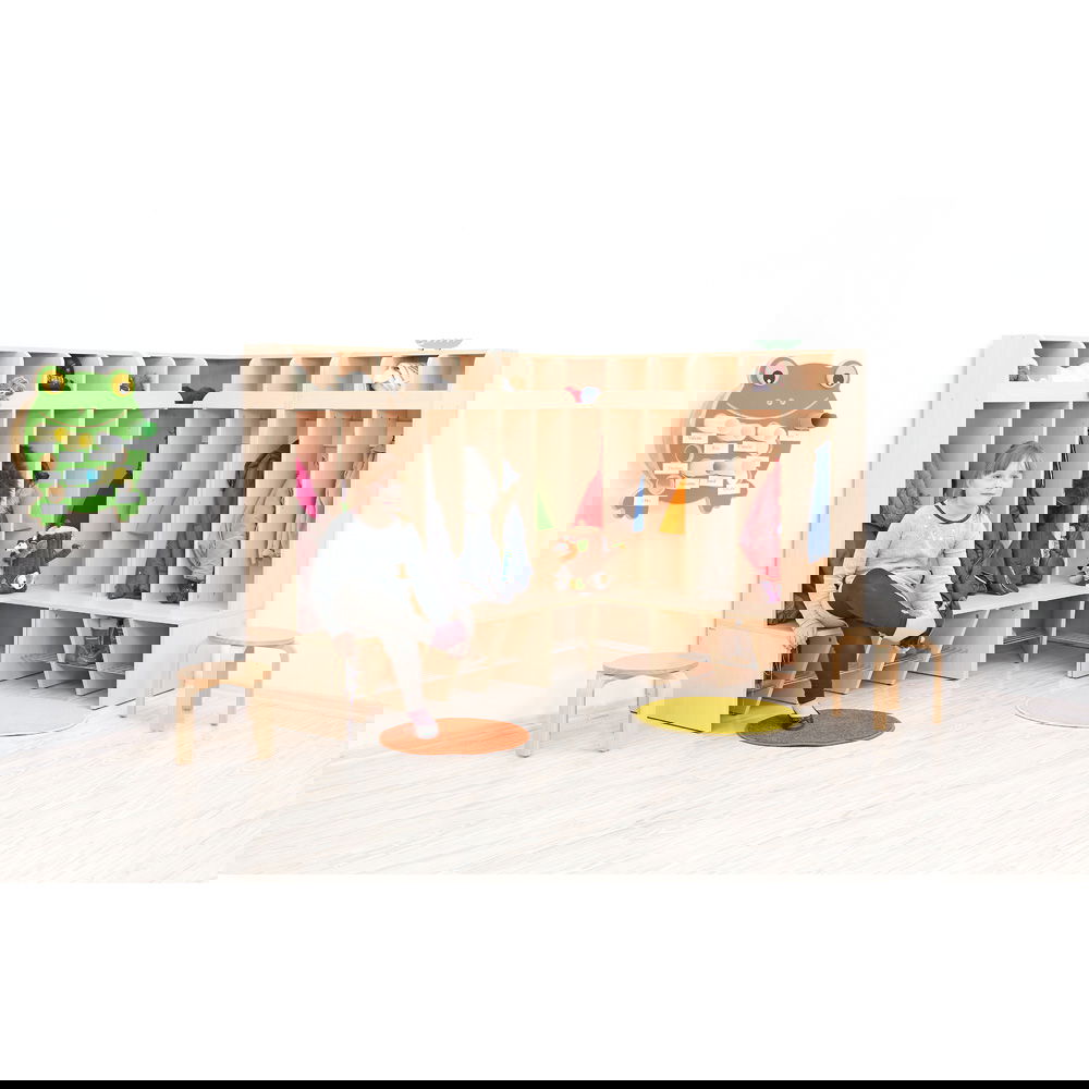 Während das mittlere Eckfach offen bleibt, können die seitlichen Fächer mit separat erhältlichen Türen in verschiedenen Farben ausgestattet werden. So können Sie farbliche Akzente setzen, die das freundliche Ahorn-Dekor ergänzen und den Kindern helfen, ihre Plätze noch schneller wiederzufinden.