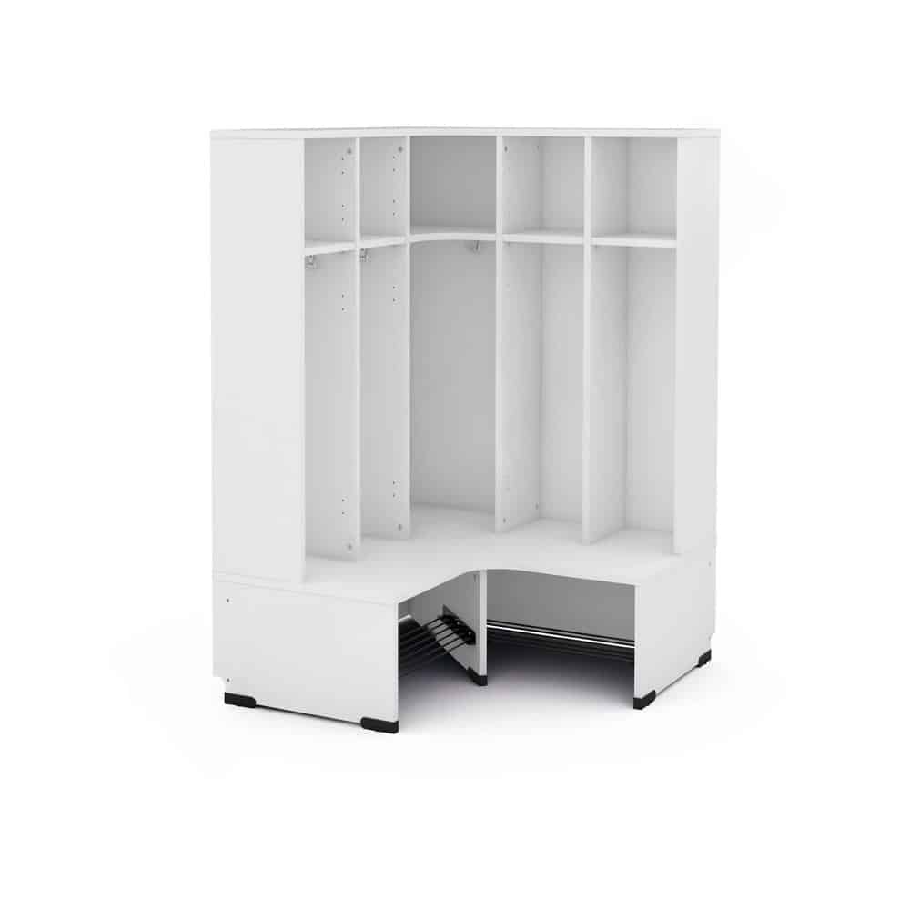 Die Sitzbank erstreckt sich über die gesamte Schrankfläche und verfügt über eine eingebaute Schuhablage mit Gitterrost, die eine ordentliche Aufbewahrung ermöglicht. Jedes der Fächer hat Vorbohrungen für zusätzliche Dreifach-Haken, die separat bestellt werden können. Die praktische Aussparung für die Sockelleiste sorgt für eine harmonische Integration in jede Einrichtung.