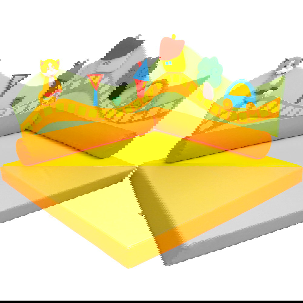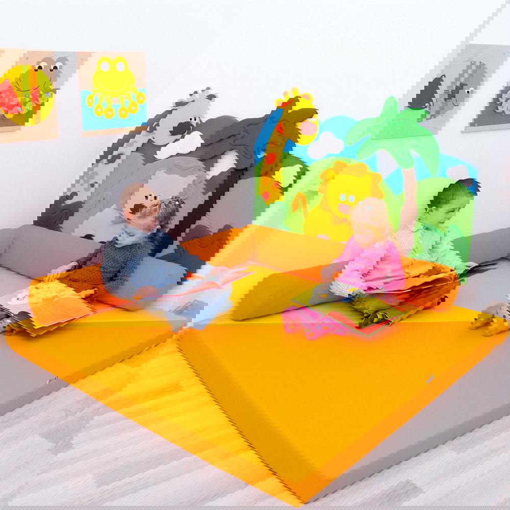 Die Matte inspiriert zu motorischen Übungen und dient gleichzeitig als gemütlicher Rückzugsort zum Lesen, Ausruhen und Entspannen.