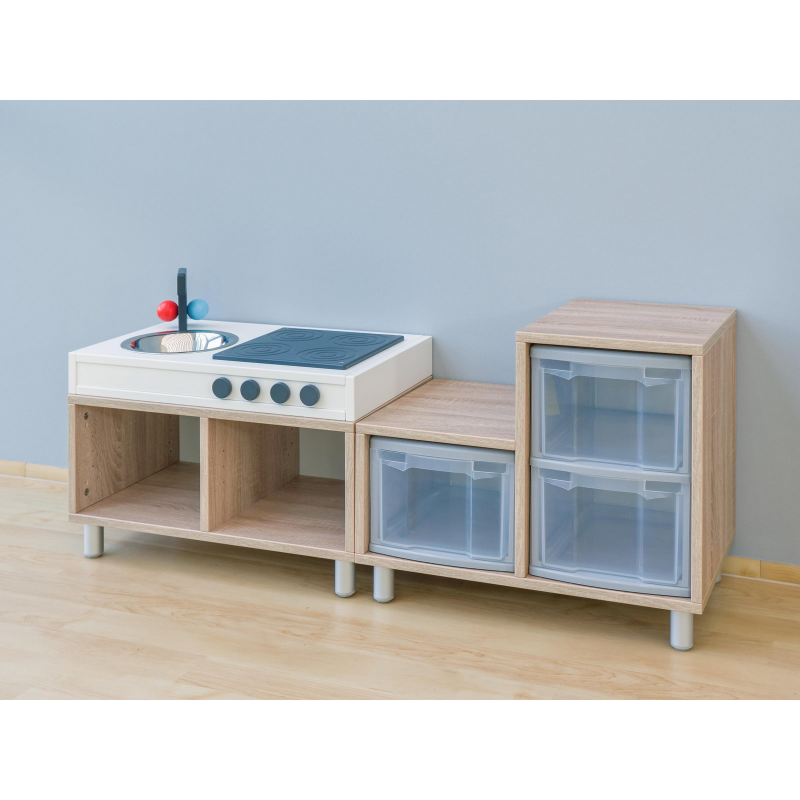 - Hochwertige Materialien: Die 19 mm starken Spanplatten im Eichedekor sind extrem widerstandsfähig, kratzfest und pflegeleicht. Sie halten auch wilderen Spielphasen problemlos stand.