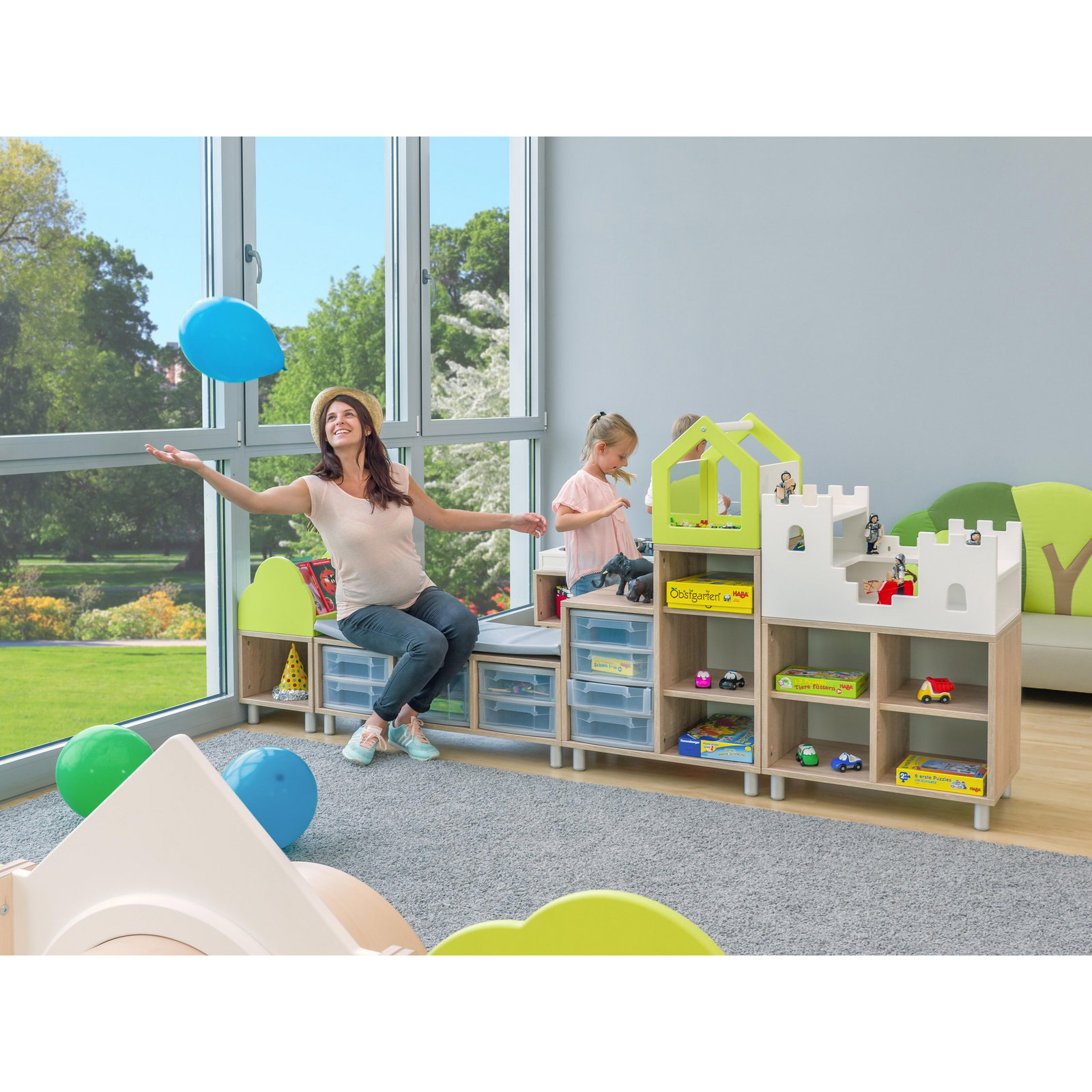 - Alles in Reichweite: Die Regalhöhen sind so konzipiert, dass Kinder selbstständig auf Materialien zugreifen und diese auch wieder aufräumen können. Das stärkt das Selbstvertrauen und fördert die Ordnungsliebe von Anfang an.