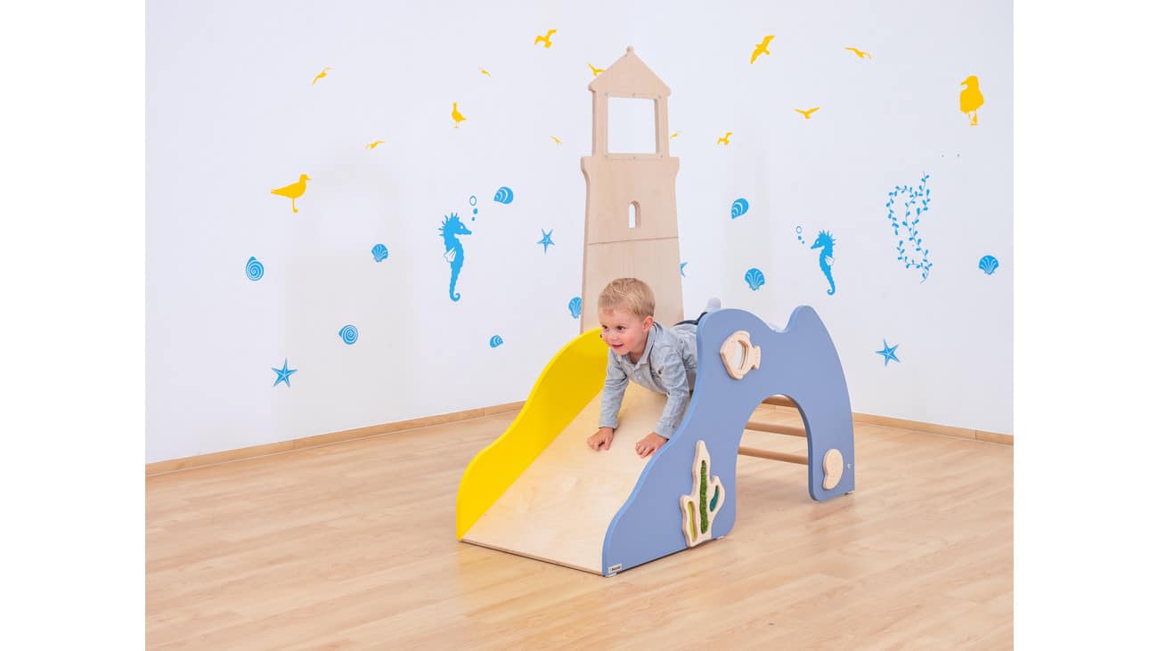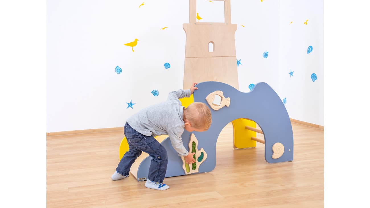 Die Spielburg in Form eines bunten Leuchtturms begeistert jedes Kind. An den stabilen Sprossen aus echtem Buchenholz können die Kleinen hochklettern und mit einem fröhlichen Lächeln die Rutsche hinunter sausen. Aber das ist noch lange nicht alles! Die verschiedenen Fühl- und Tastelemente, wie die drehbare Schnecke, die strukturierte Muschel und der niedliche Fisch mit Spiegelelement, laden zum Erkunden und Entdecken ein. Diese interaktiven Elemente fördern nicht nur die Sinne, sondern unterstützen auch die Feinmotorik und das kreative Spiel.