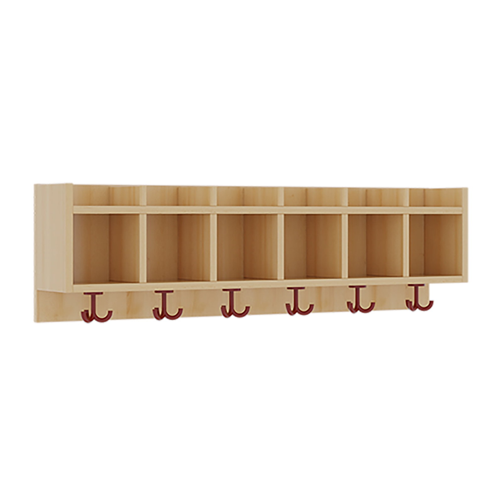 Das modulare Design dieser Garderobe überzeugt durch seine intelligente und kindgerechte Aufteilung. Stabile Mittelwände trennen die einzelnen Plätze klar voneinander ab, sodass jedes Kind genau weiß, wo sein persönlicher Bereich beginnt und endet. Ganz oben befinden sich nach oben offene, fünf Zentimeter hohe Ablagen. Diese eignen sich ideal für Mitteilungshefte, wichtige Post an die Eltern oder kleine Handschuhe. Direkt darunter liegen die 17 Zentimeter hohen, offenen Hauptfächer. Diese bieten ausreichend Raum für Mützen, Schals oder kleine Turnbeutel. Den funktionalen Abschluss bilden die robusten, farbigen 3fach-Kleiderhaken im unteren Bereich. An diesen leicht drehbaren Haken finden selbst dicke Winterjacken, Matschhosen und vollgepackte Rucksäcke einen sicheren und festen Halt. Durch die stabile Wandmontage sparen Sie wertvolle Bodenfläche, die Sie effektiv für Schuhregale, gemütliche Sitzbänke oder einfach als Bewegungsraum nutzen können.