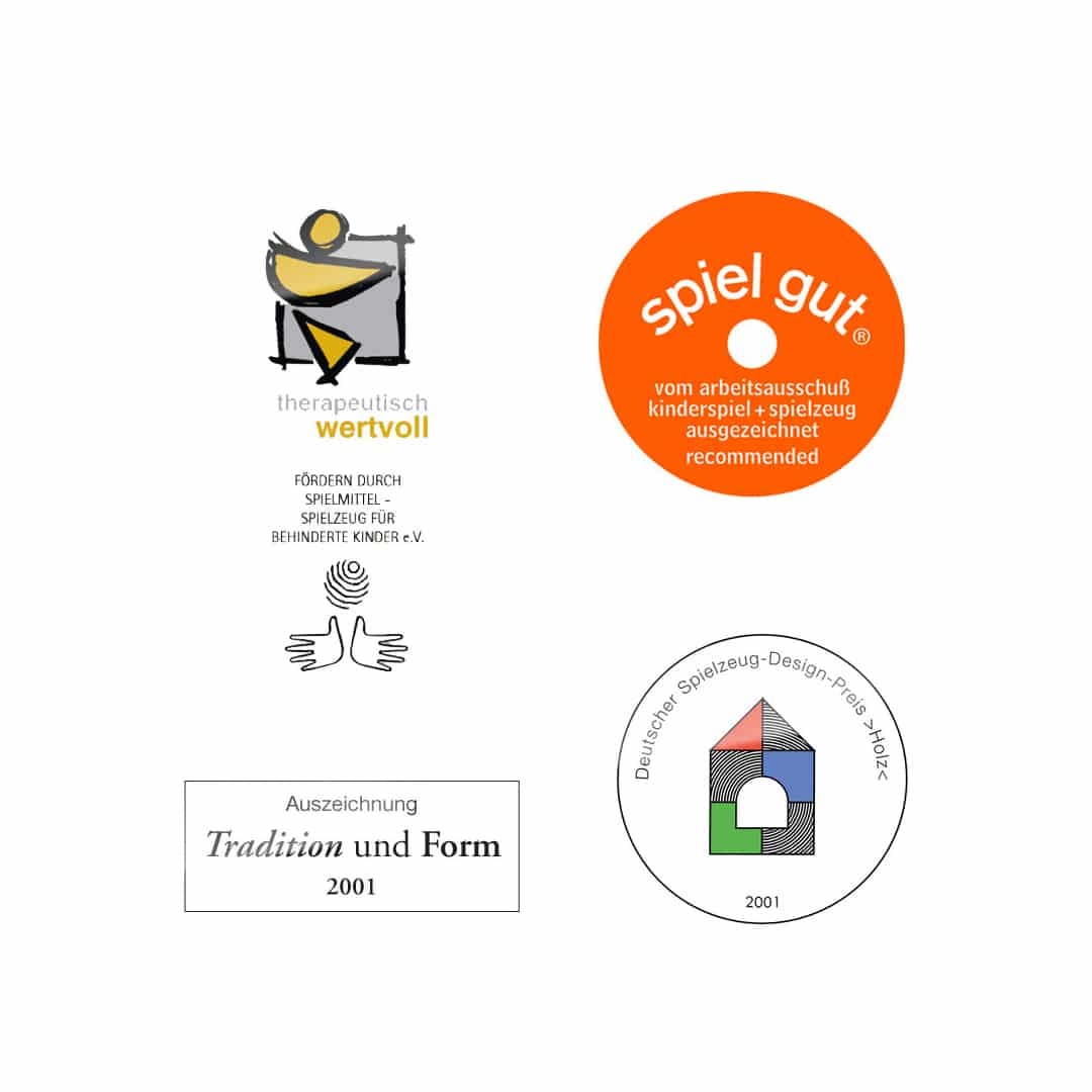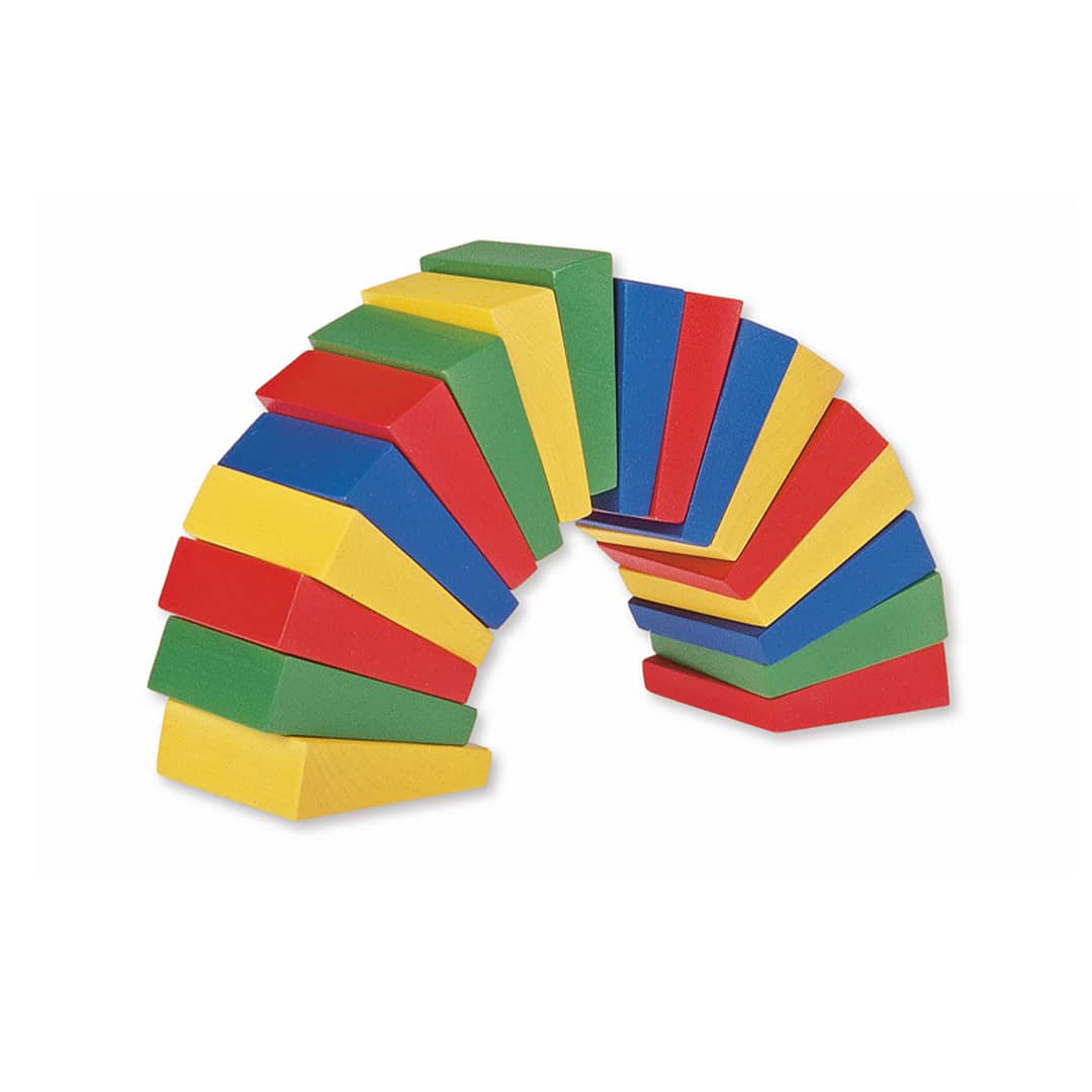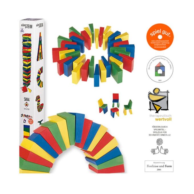 Das Bauspiel aus Buchenholz heißt einSTEIN, weil alle 36 Bausteine in einer einzigen Form hergestellt sind – je 9 Stück in den Farben rot, blau, grün und gelb. Alle 36 Bausteine (Grundmaß 66,66 mm) haben durch ein spezielles Verfahren eine rauhe Oberfläche für eine bessere Haftung erhalten. Diese ist notwendig, um schwierige Bauwerke wie zum Beispiel die Brücke errichten zu können. Kinder können sich insbesondere in Konzentration und Feinmotorik üben sowie ein Gespür für Schwerpunkte entwickeln.