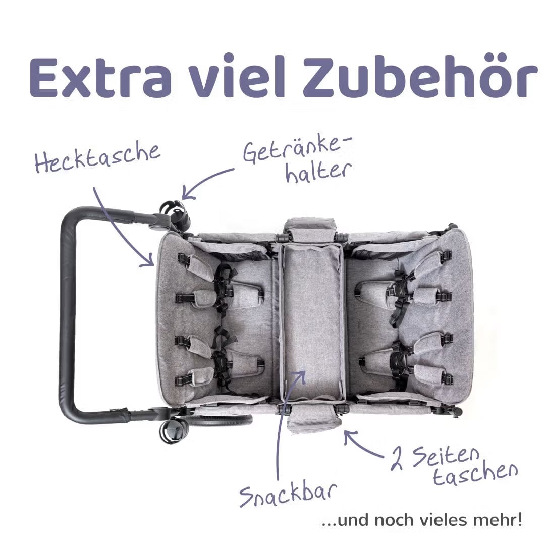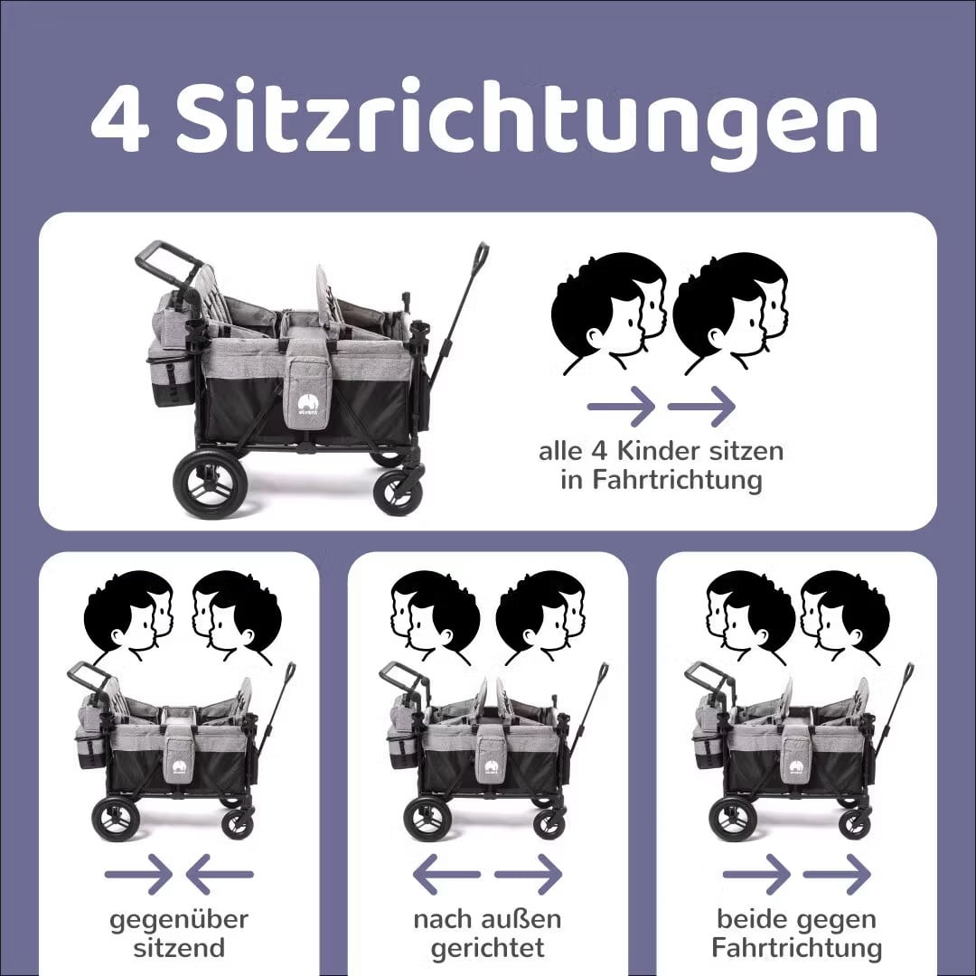 Dieser einzigartige Premium-Bollerwagen ist mehr als nur Transport – er ist der Rolls-Royce unter den Familienwagen und bietet ein Komfort-Level, das selbst anspruchsvollste Eltern begeistert.