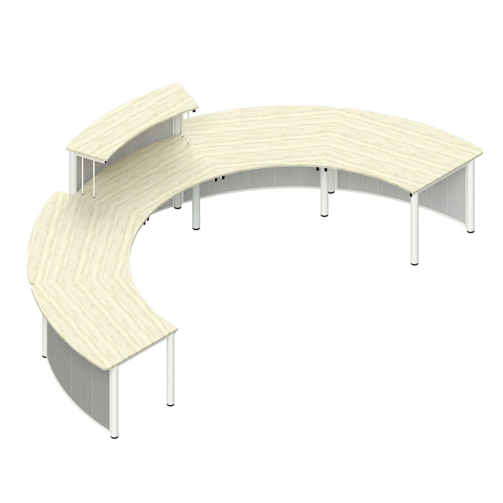 Erleben Sie Empfangsgestaltung in ihrer vollendeten Form mit der Empfangstheke Recknitz 5-2, einer außergewöhnlichen 5-teiligen Thekenkonstruktion, die neue Maßstäbe in der professionellen Empfangsarchitektur setzt. Diese imposante Lösung aus fünf harmonisch verbundenen 36°-Bögen schafft mit ihrem großzügigen Platzbedarf von 420 x 202 cm einen repräsentativen Empfangsbereich der absoluten Extraklasse. Die durchdachte Kombination aus höhenverstellbarer Arbeitsplatte, robuster Stahlkonstruktion und individueller Gestaltungsfreiheit durch die magnethaftende Lochblech-Frontblende macht diese Premium-Theke zur ersten Wahl für Großunternehmen, internationale Konzerne, Hotels und öffentliche Einrichtungen, die einen unvergesslichen ersten Eindruck hinterlassen und gleichzeitig höchste Arbeitseffizienz für große Teams gewährleisten möchten. Als Flaggschiff der bewährten Recknitz-Serie vereint sie repräsentative Ausstrahlung mit modularer Flexibilität für zukünftige Anpassungen.