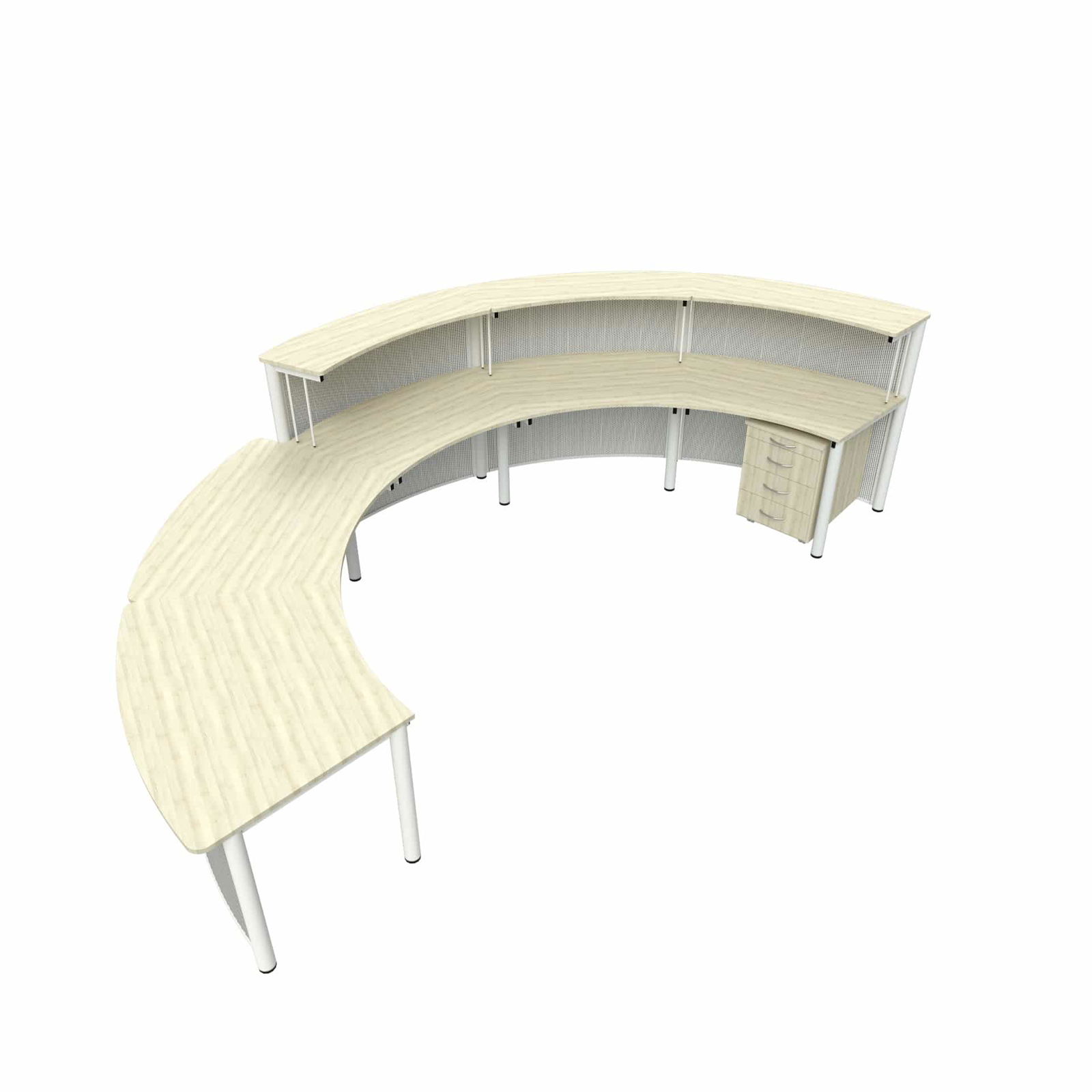 Entdecken Sie die ideale Lösung für anspruchsvolle Empfangsbereiche mit der Empfangstheke Recknitz 5-3, einer beeindruckenden 5-teiligen Thekenkonstruktion, die professionelle Ausstrahlung mit durchdachter Funktionalität vereint. Diese elegante Lösung aus fünf harmonisch verbundenen 36°-Bögen schafft mit ihrem optimierten Platzbedarf von 412 x 202 cm einen repräsentativen Empfangsbereich, der sowohl imposant als auch praktisch ist. Die robuste Stahlkonstruktion mit höhenverstellbarer Arbeitsplatte und individueller Gestaltungsfreiheit durch die magnethaftende Lochblech-Frontblende macht diese Premium-Theke zur perfekten Wahl für Großunternehmen, Hotels und öffentliche Einrichtungen, die einen beeindruckenden ersten Eindruck hinterlassen möchten. Mit der optionalen Rollcontainer-Ausstattung lässt sich diese Theke perfekt an spezielle Arbeitsanforderungen anpassen und bietet maximale Flexibilität für große Teams.