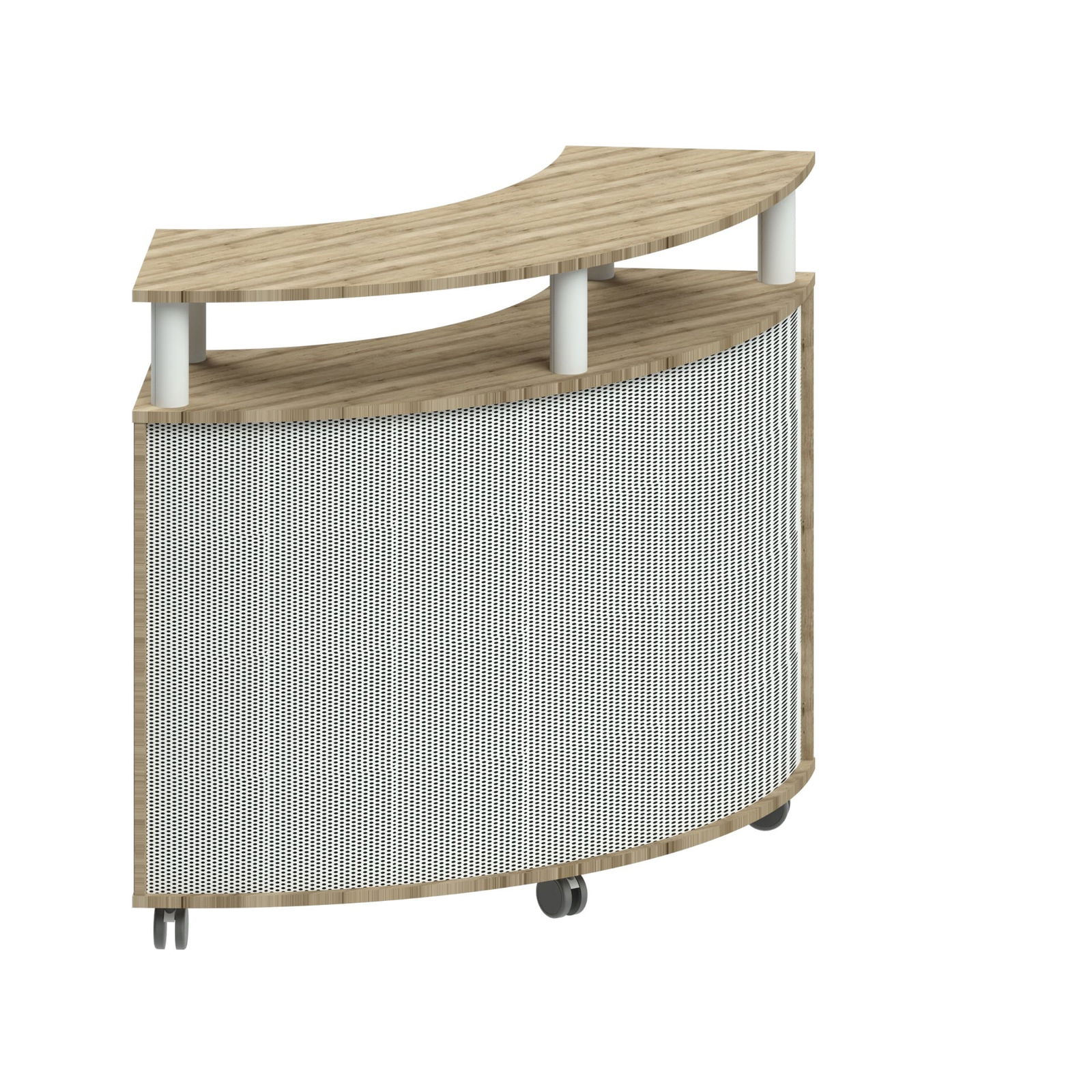 - Fahrbare Konstruktion: Hochwertige Rollen ermöglichen es, den Tresen mühelos zu bewegen und an unterschiedliche Raumsituationen anzupassen – ideal für flexible Arbeitsplatzkonzepte.