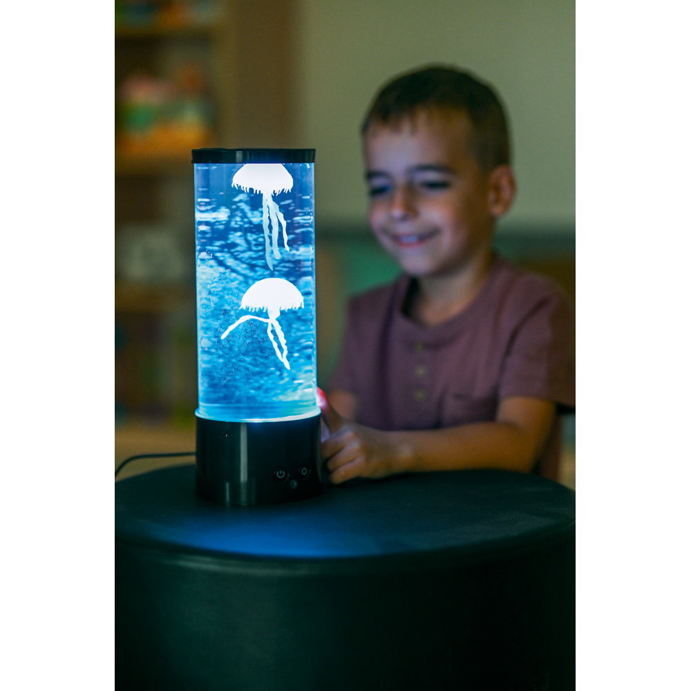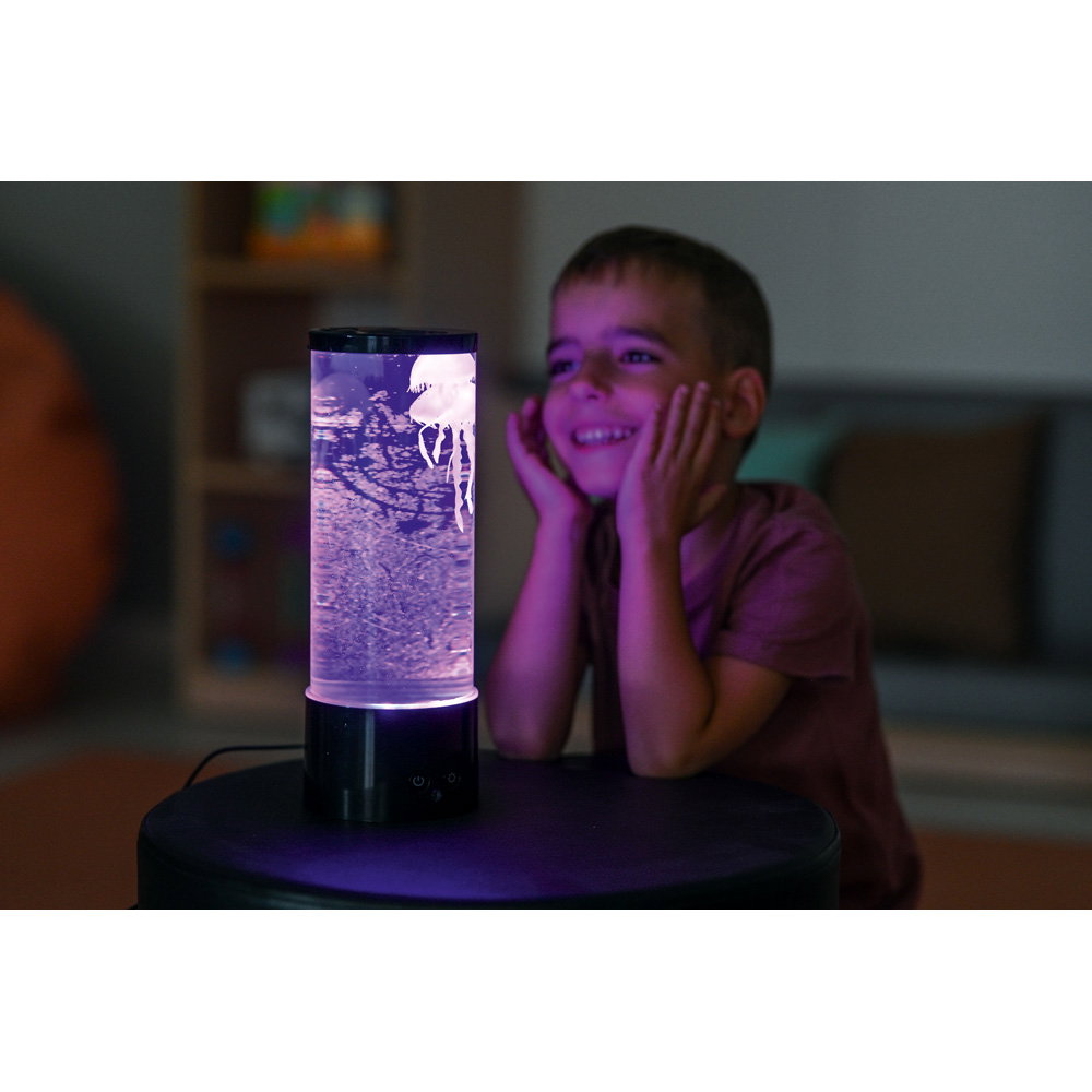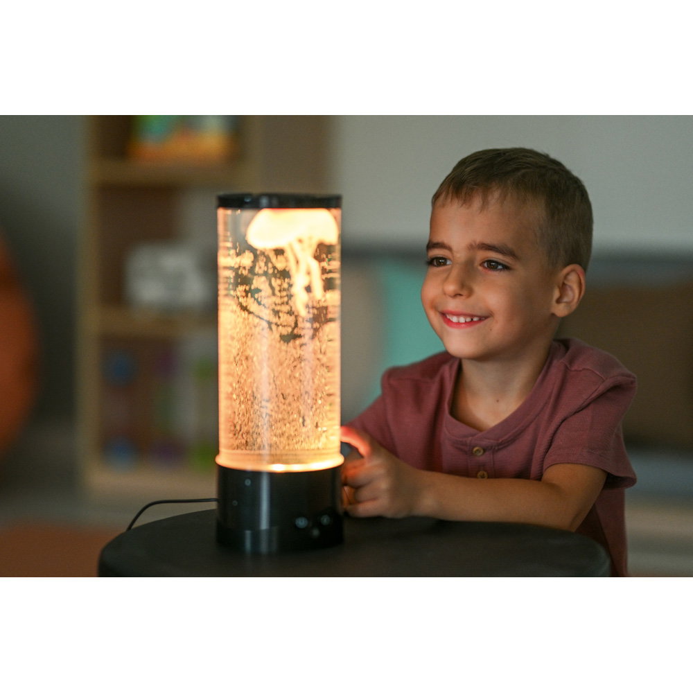 Das sanfte, rhythmische Schweben der Quallen zieht die Aufmerksamkeit auf sich und hilft dabei, den Geist zu fokussieren und äußere Ablenkungen auszublenden. Für Kinder, die Schwierigkeiten haben, Reize zu verarbeiten, bietet die Lampe einen sicheren visuellen Ankerpunkt. Das Beobachten der gleichmäßigen Bewegungen kann dabei helfen, zur inneren Ruhe zu finden, Ängste abzubauen und sich auf den Moment zu konzentrieren. Die beruhigende Wirkung macht die Lampe zu einem idealen Begleiter in Snoezelen-Räumen, therapeutischen Praxen, Klassenzimmern oder als sanftes Einschlafritual im heimischen Kinderzimmer.