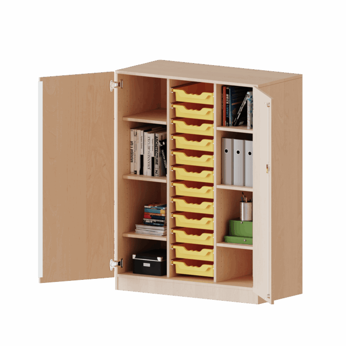 • Hohe Stabilität durch zwei Mittelwände: Die breite, dreireihige Konstruktion mit zwei festen Mittelwänden verleiht dem Schrank eine außergewöhnliche Stabilität und Belastbarkeit. Er ist damit perfekt für den intensiven Einsatz in Schulen, Kitas und Büros geeignet.